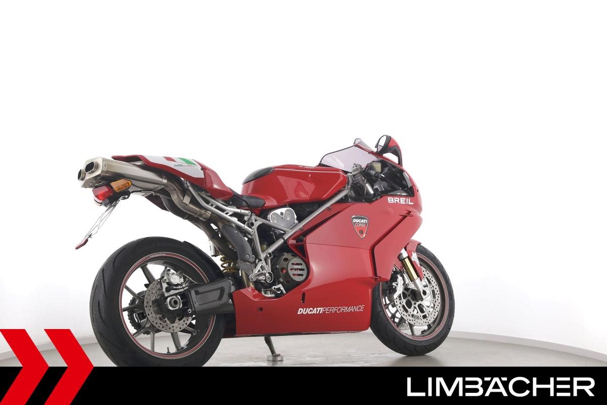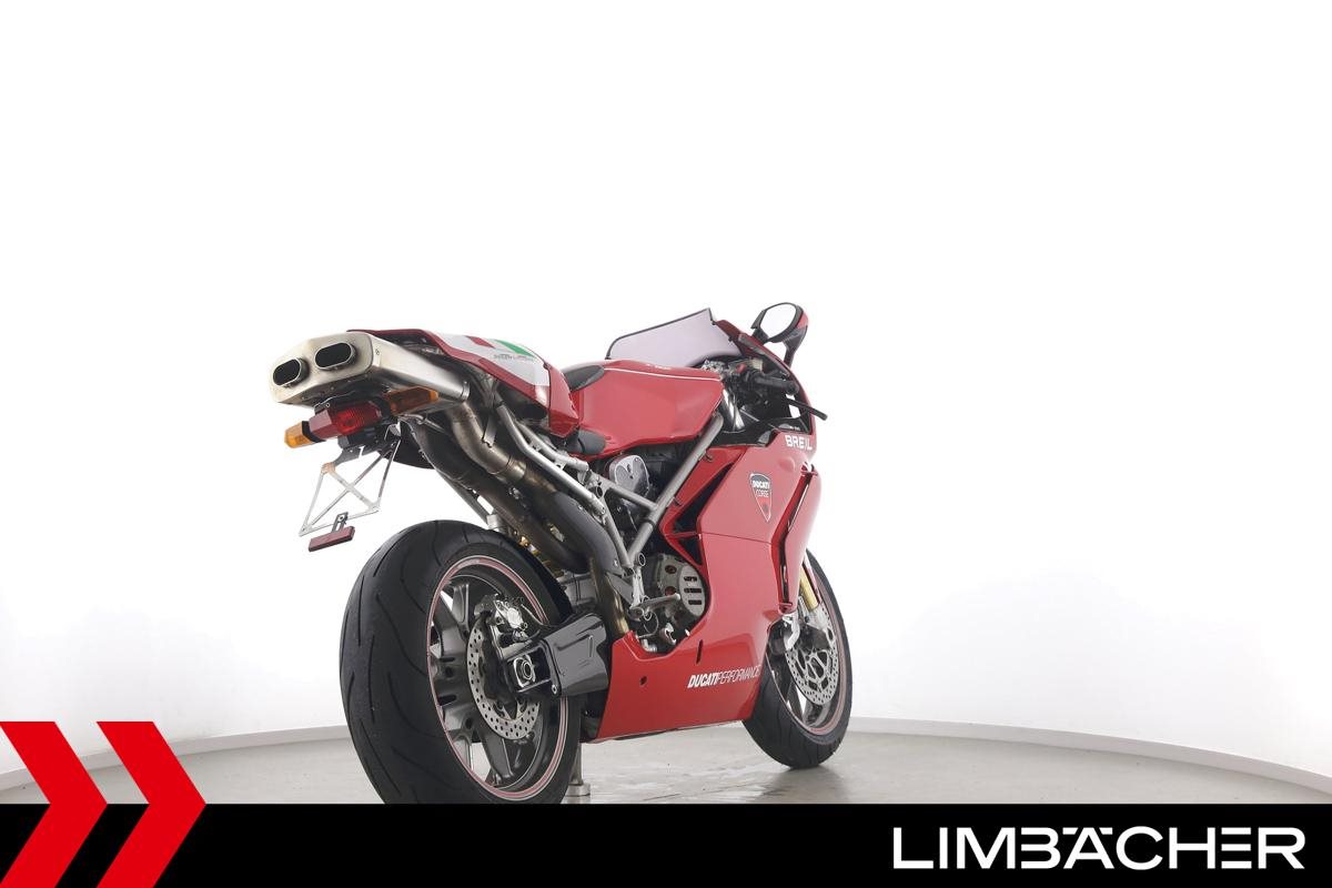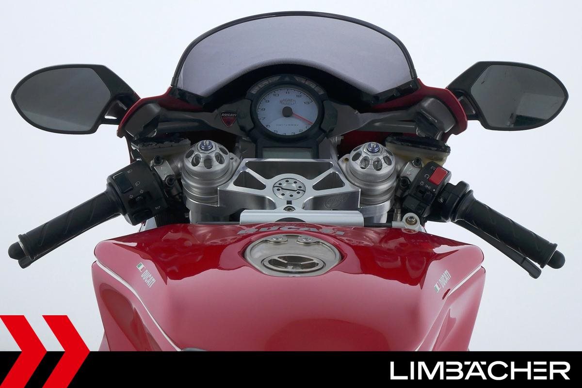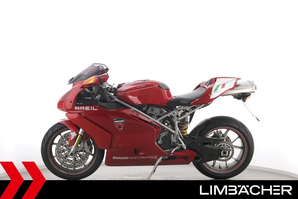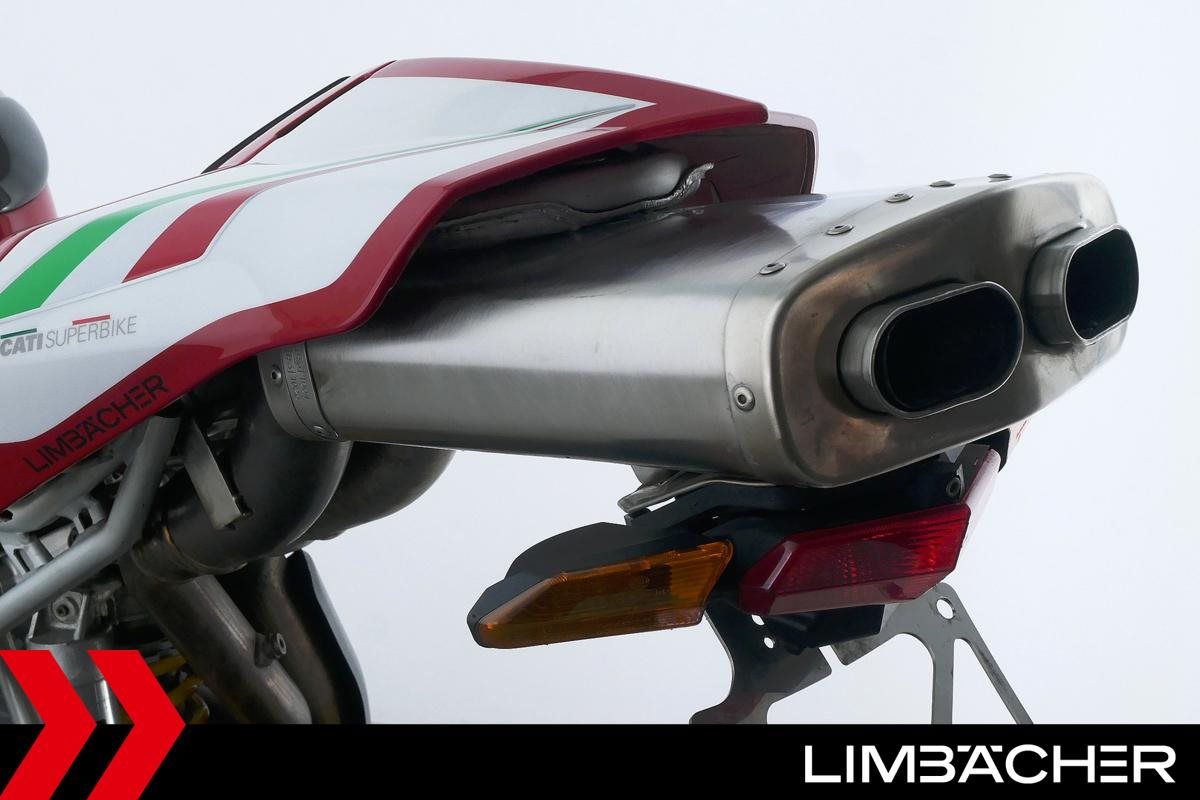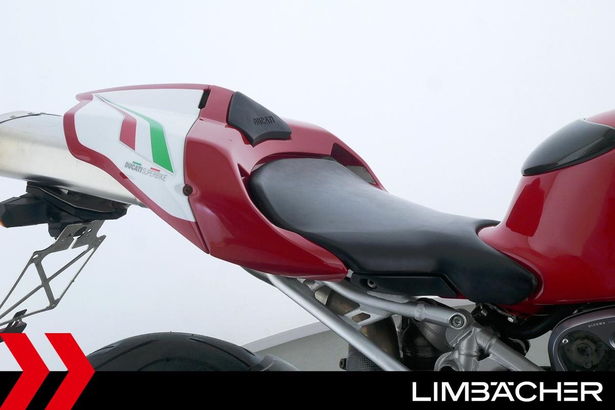 Eine Ducati 999 in gebrauchtem Zustand u.a. mit Rizoma-Riemenabdeckungen transparent sowie Carbon-Spritzschutz hinten und -Cockpitverkleidung.