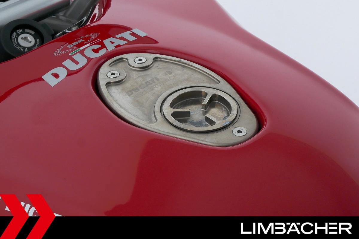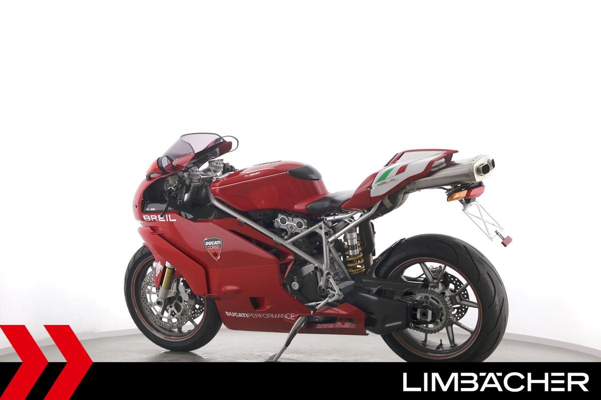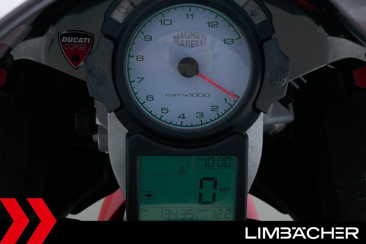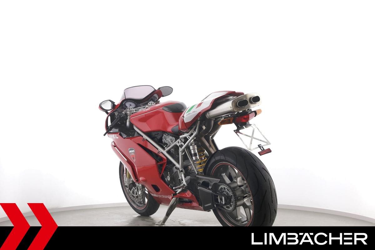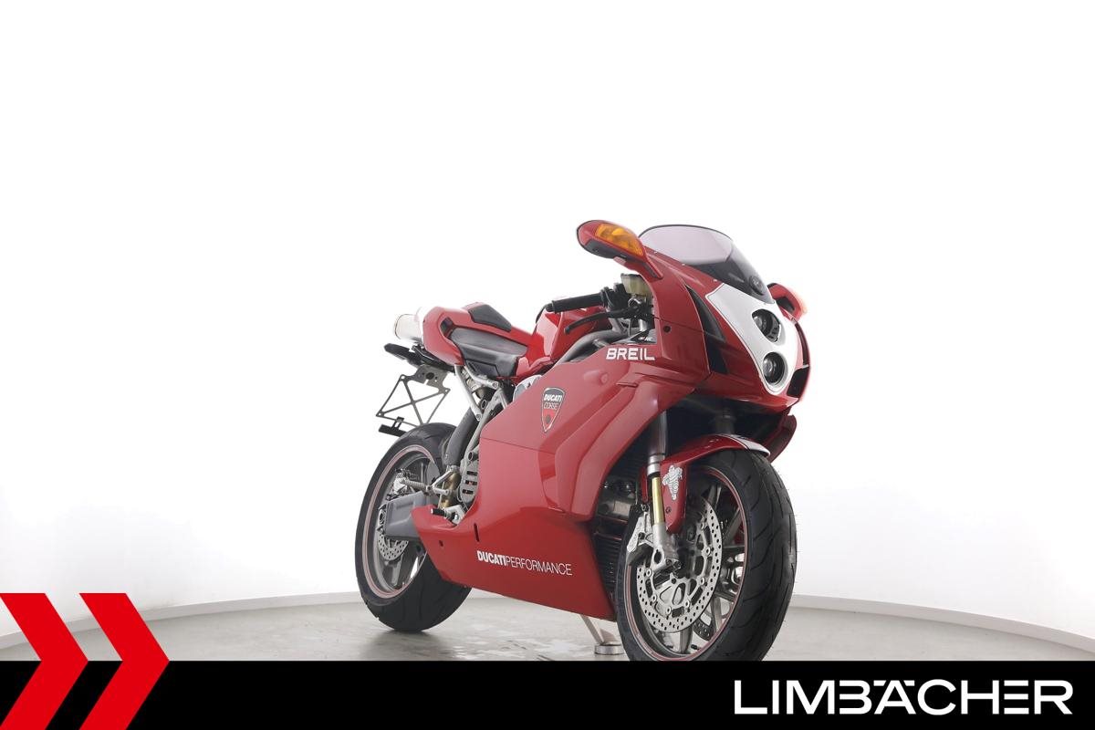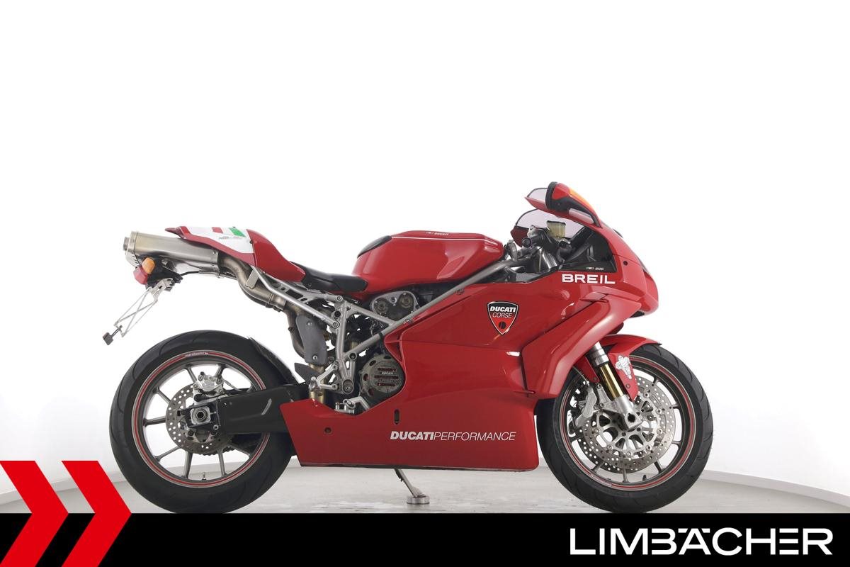 Eine Ducati 999 in gebrauchtem Zustand u.a. mit Rizoma-Riemenabdeckungen transparent sowie Carbon-Spritzschutz hinten und -Cockpitverkleidung.