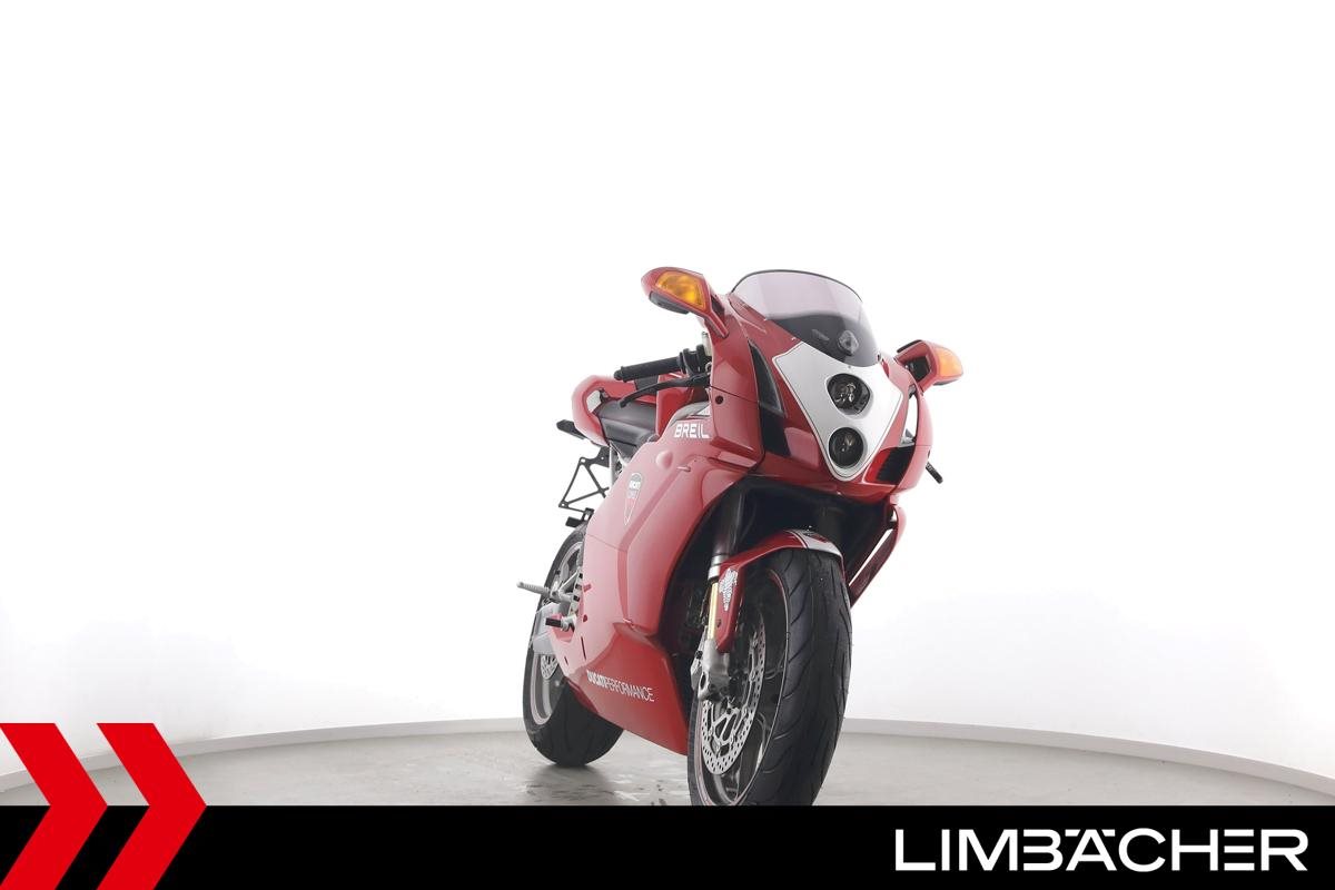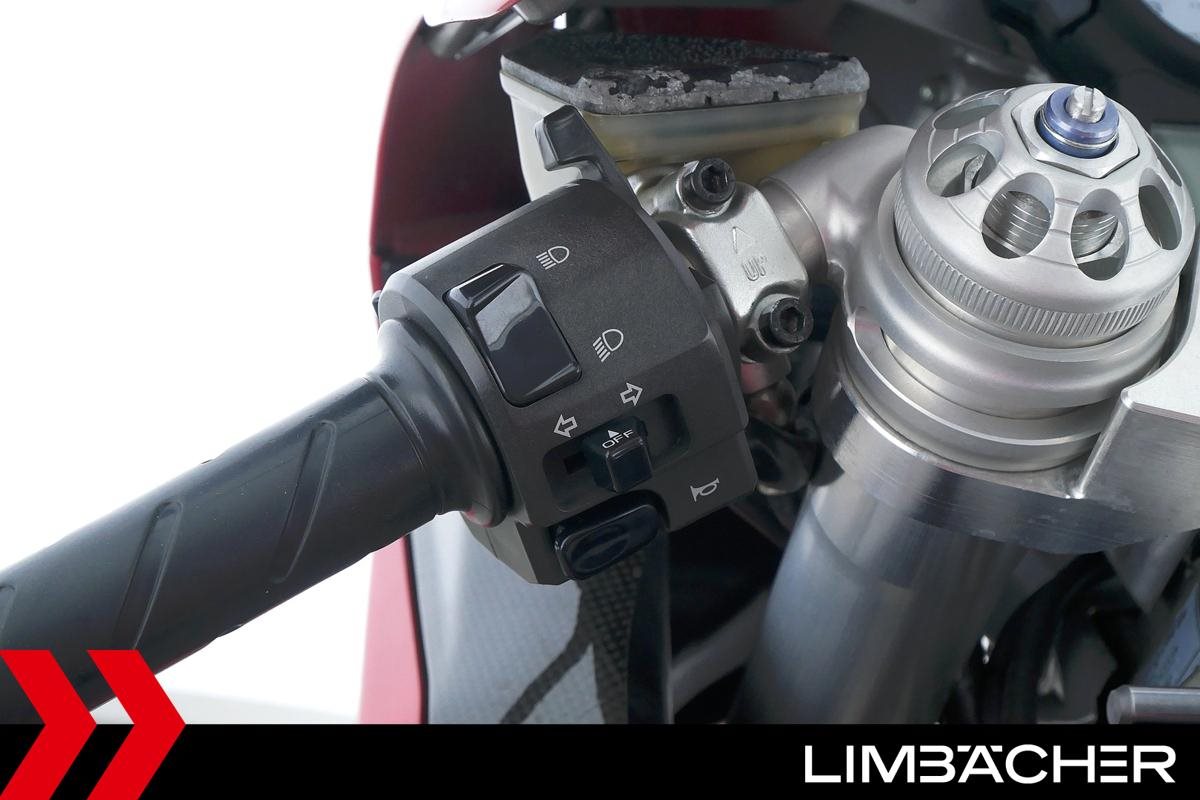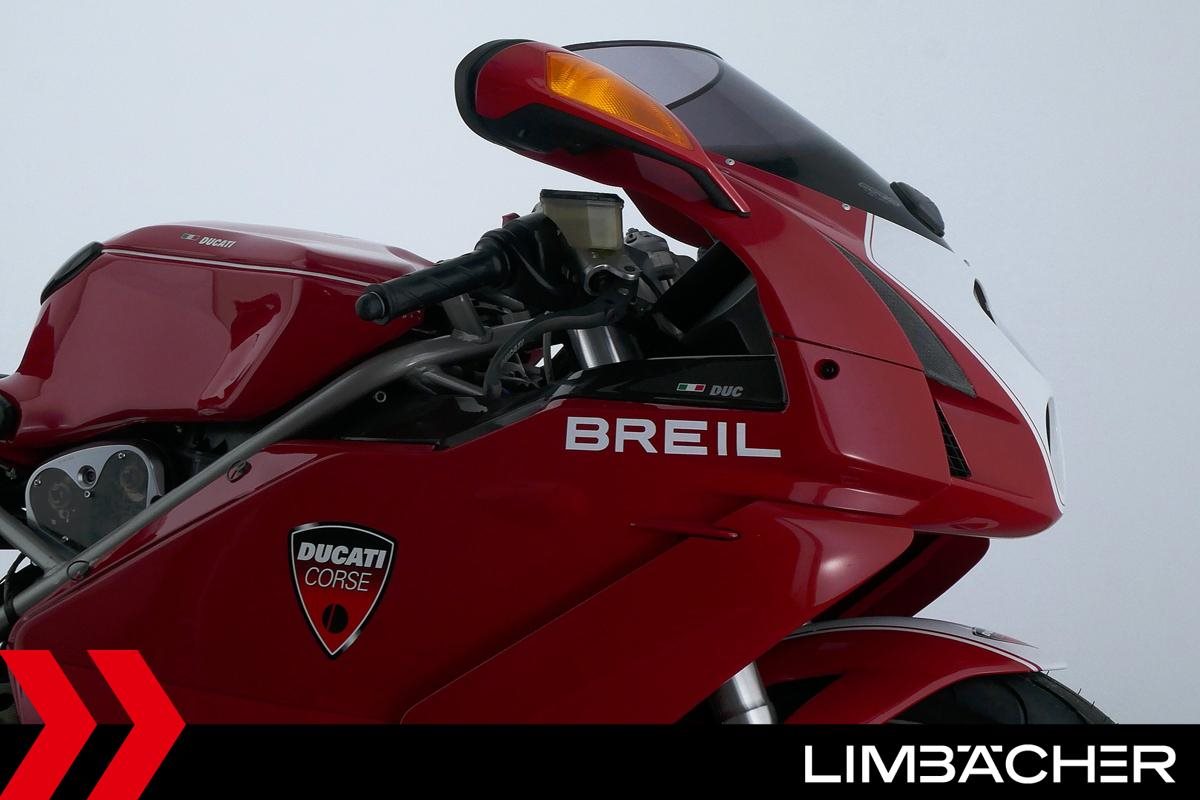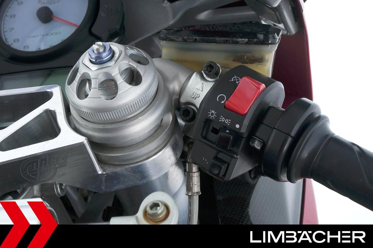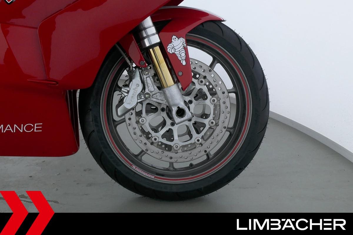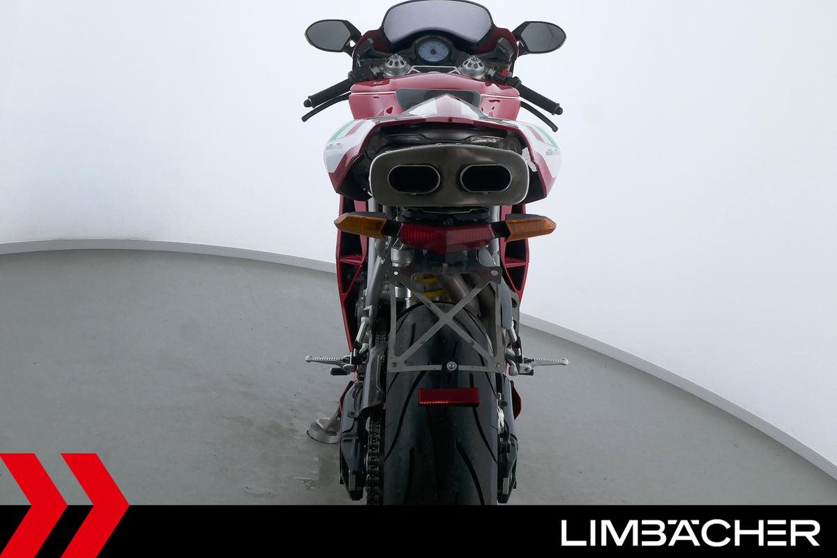 Eine Ducati 999 in gebrauchtem Zustand u.a. mit Rizoma-Riemenabdeckungen transparent sowie Carbon-Spritzschutz hinten und -Cockpitverkleidung.