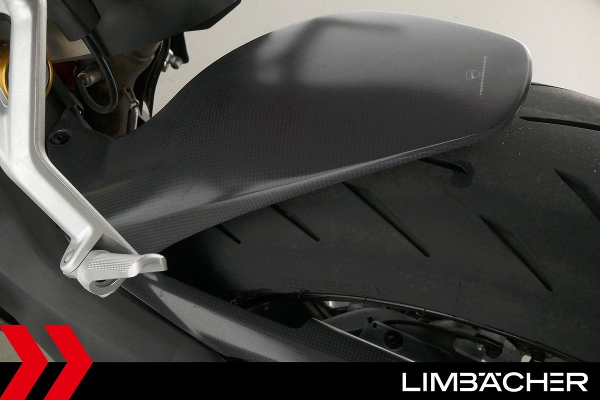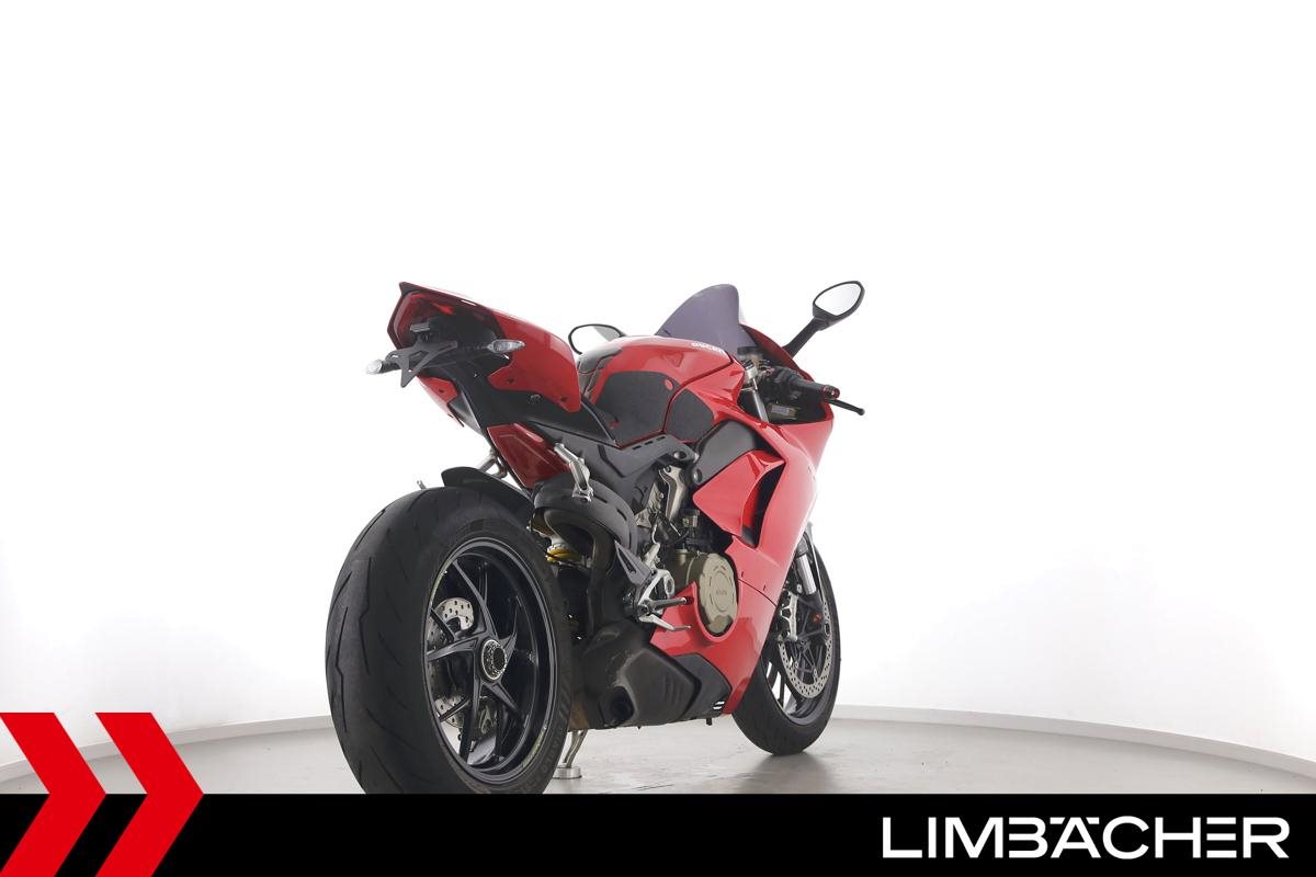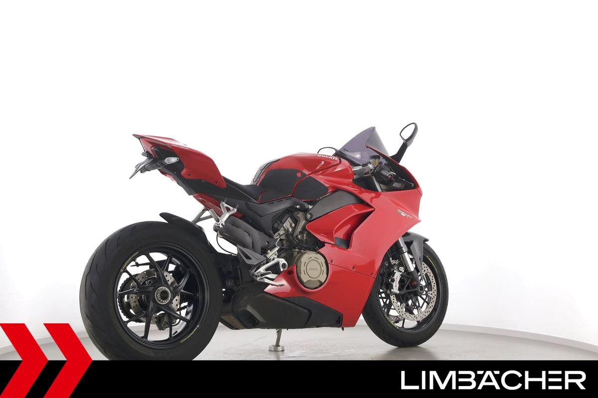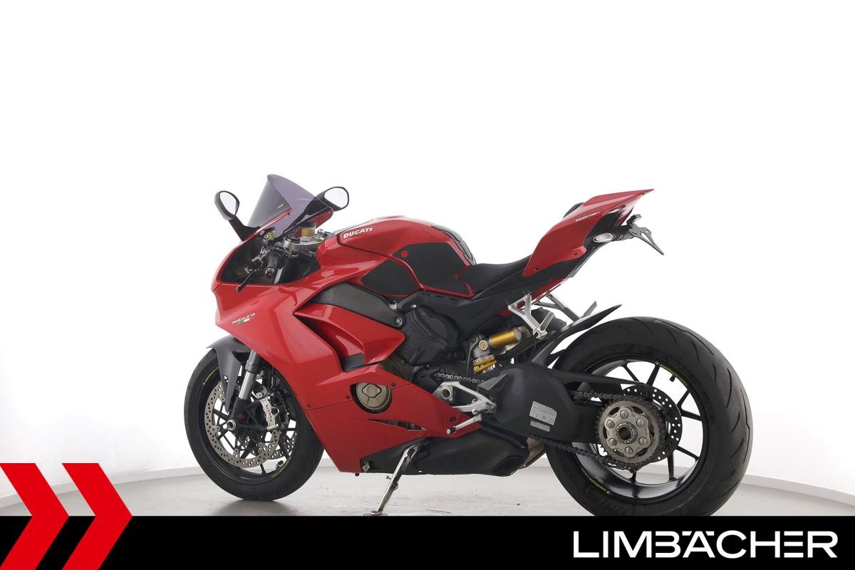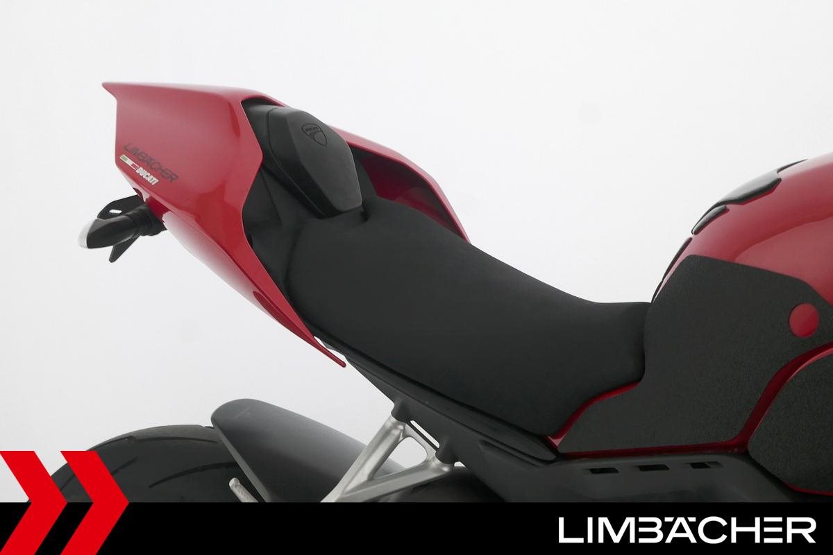 Eine scheckheftgepflegte Ducati Panigale V4 aus zweiter Hand in gepflegtem Zustand u.a. mit kurzem Kennzeichenhalter sowie Carbon-Front- und -Heckfender.
