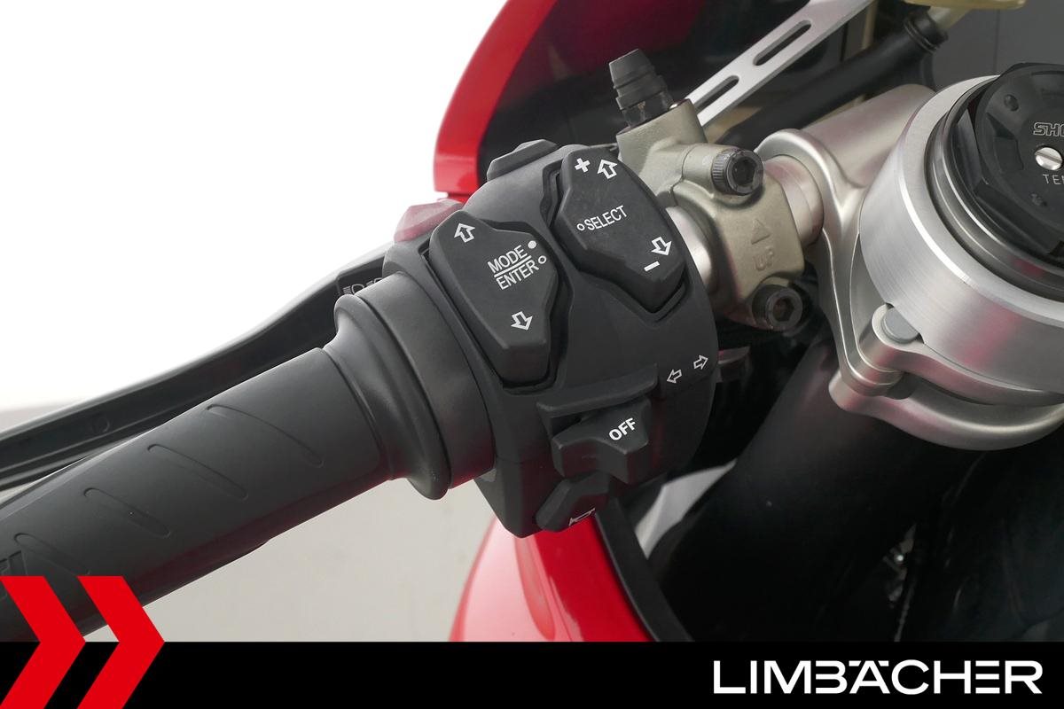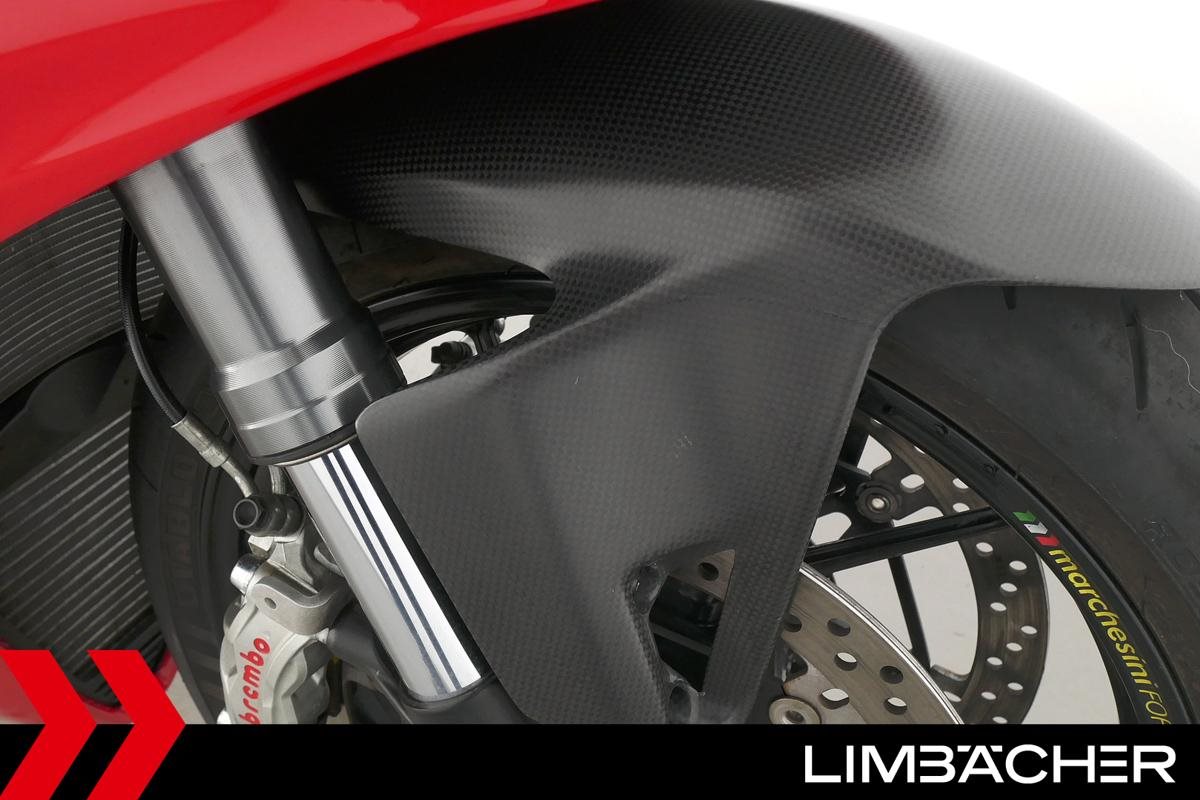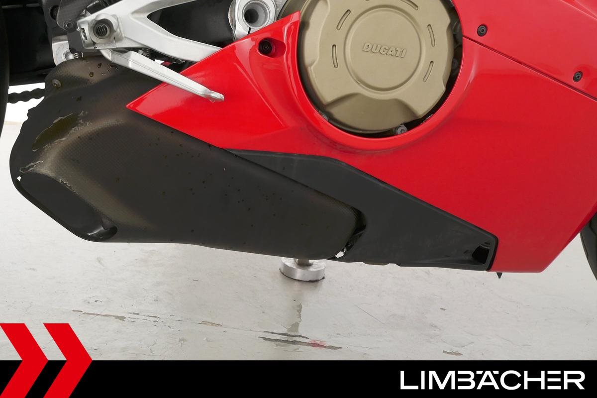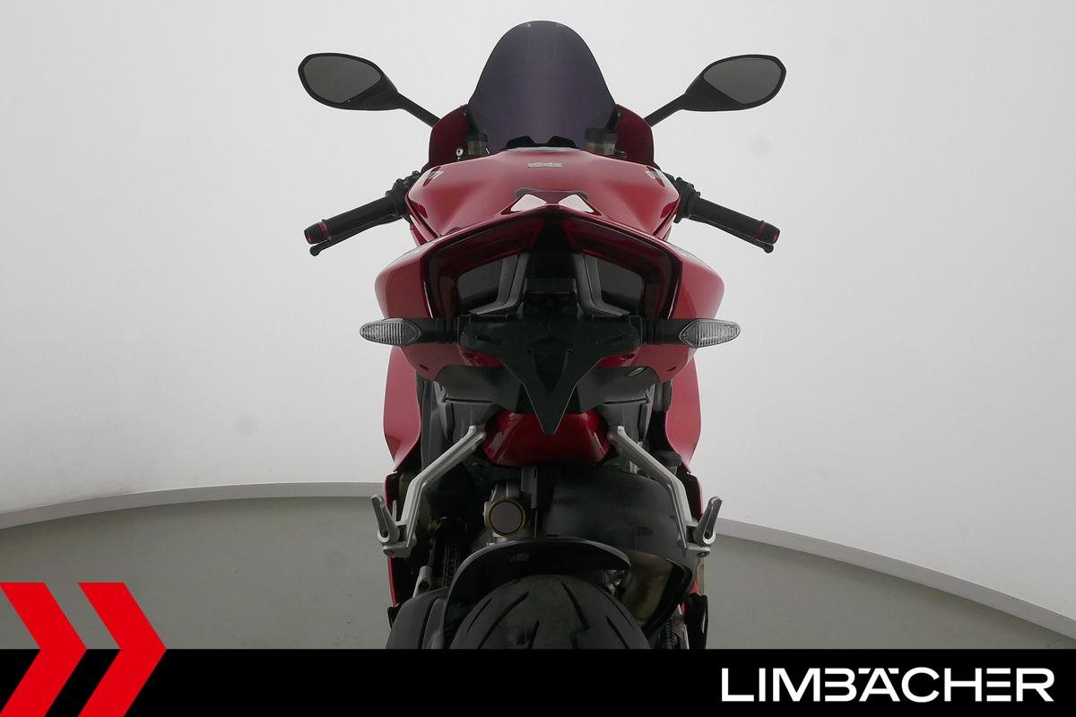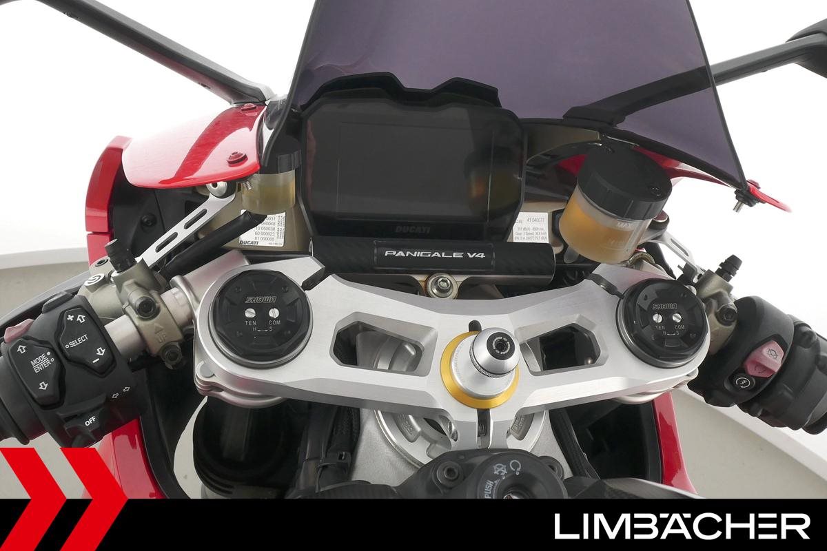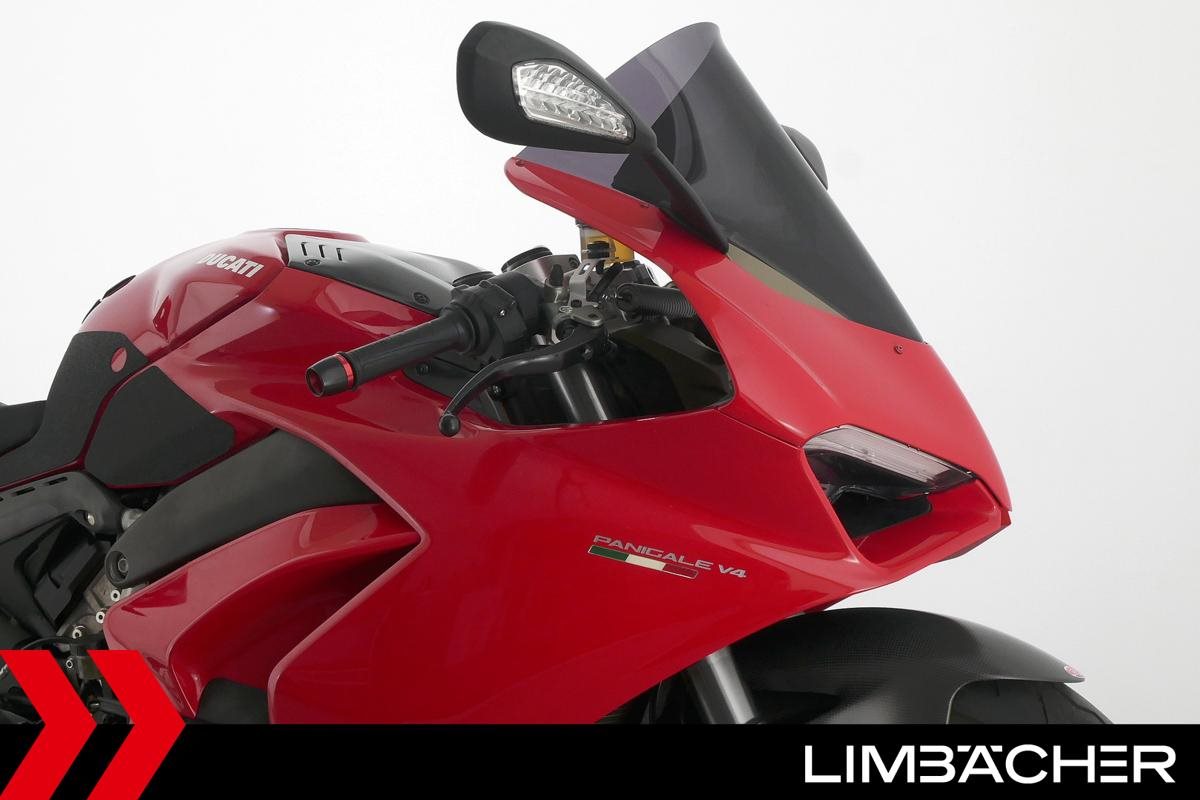Eine scheckheftgepflegte Ducati Panigale V4 aus zweiter Hand in gepflegtem Zustand u.a. mit kurzem Kennzeichenhalter sowie Carbon-Front- und -Heckfender.