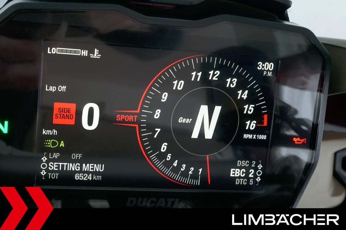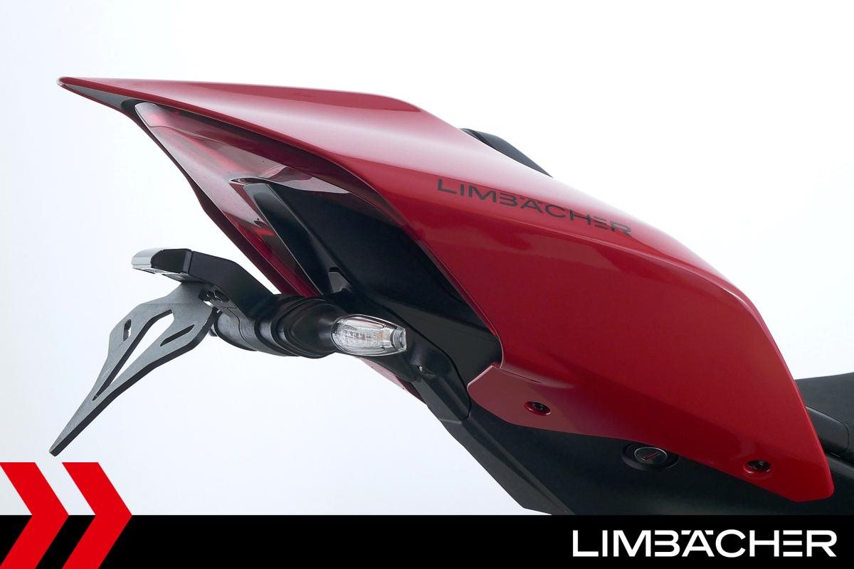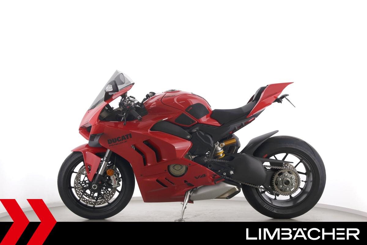 Eine Ducati Panigale V4 aus zweiter Hand in gepflegtem Zustand u.a. mit kurzem Kennzeichenhalter und Ducati-Performance-LED-Blinkern.