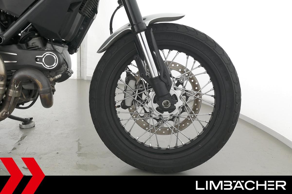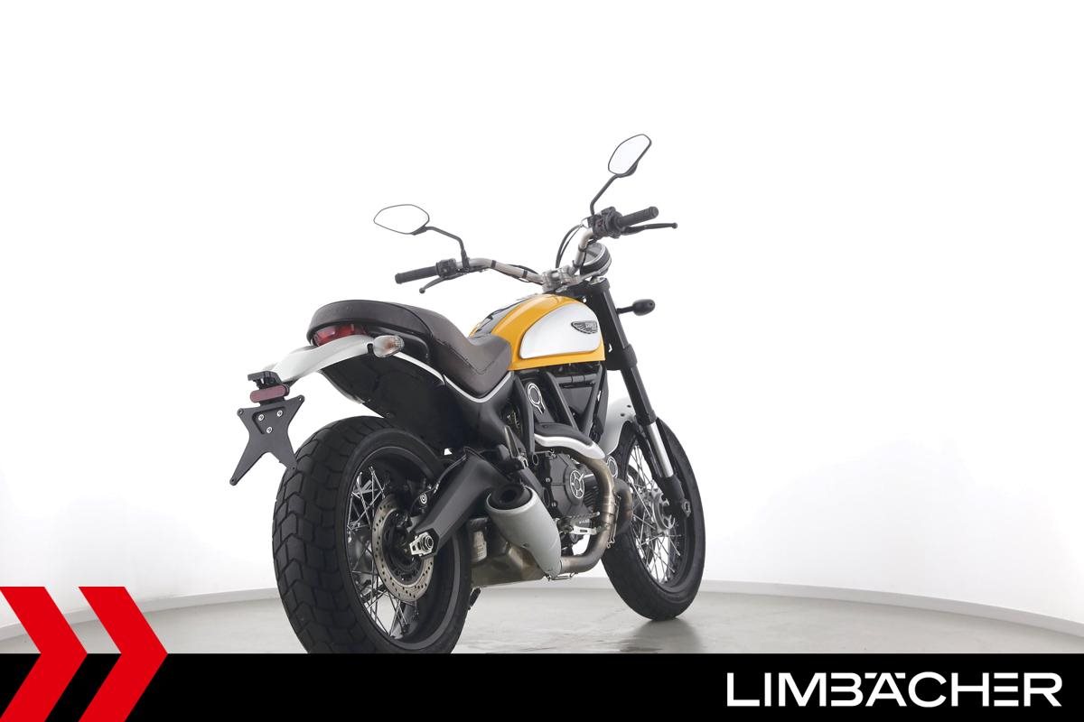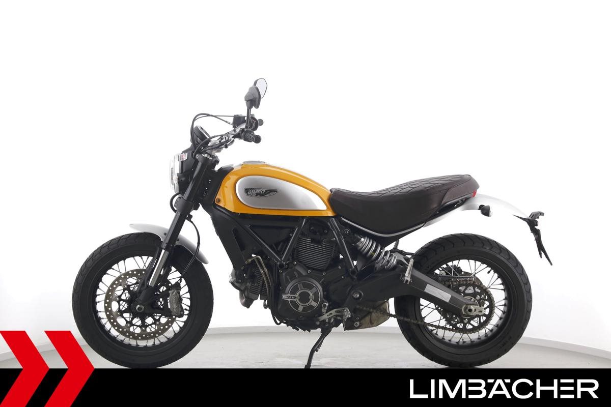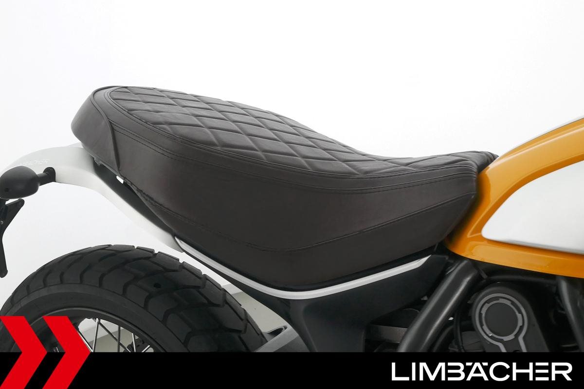 Eine Ducati Scrambler Classic aus zweiter Hand in gepflegtem Zustand u.a. mit neuen Zahnriemen sowie brauner Classic-Sitzbank.