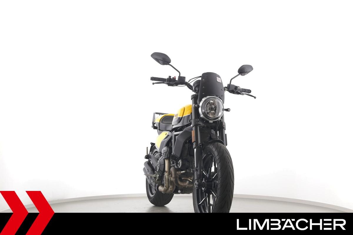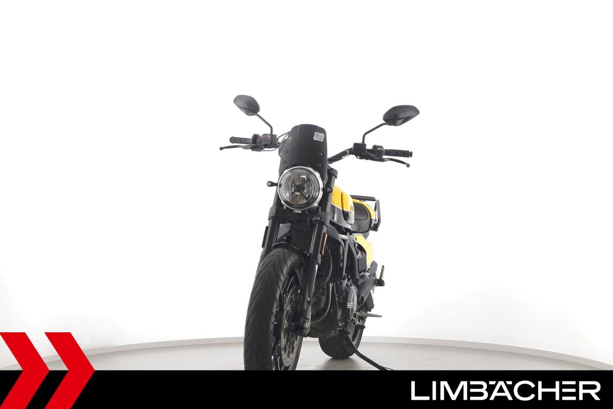 Eine Ducati Scrambler Full Throttle in gepflegtem Zustand u.a. mit Gepäckträger und Windschild.