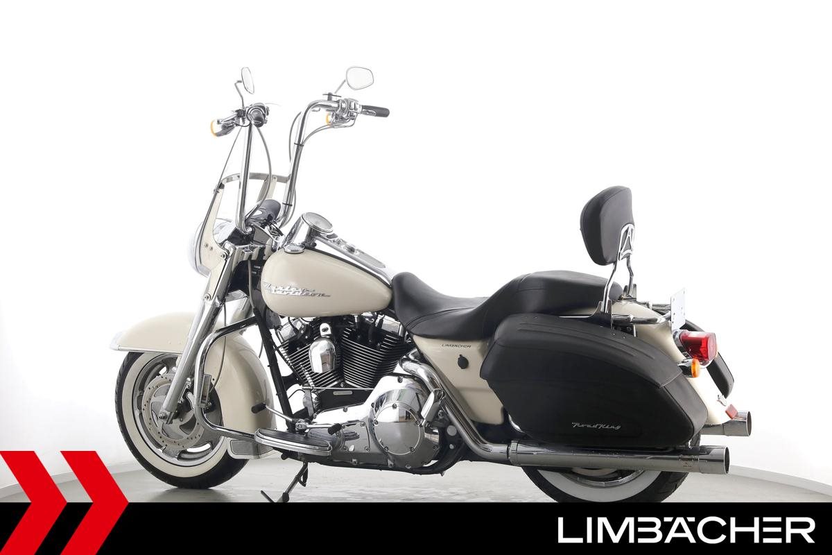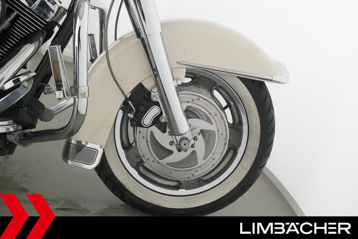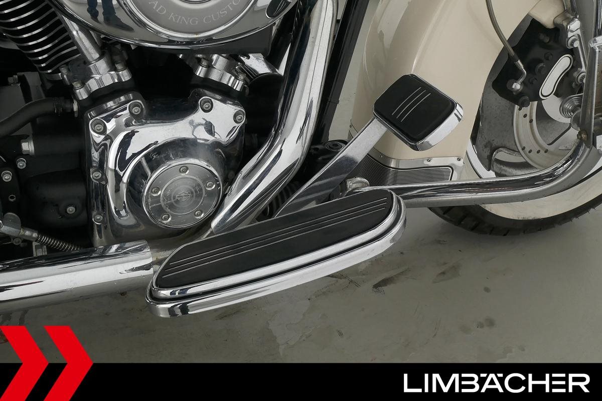Eine Harley-Davidson Road King Custom FLHRSI in gepflegtem Zustand u.a. mit Penzl-Klappenauspuff manuell sowie Sturzbügeln.