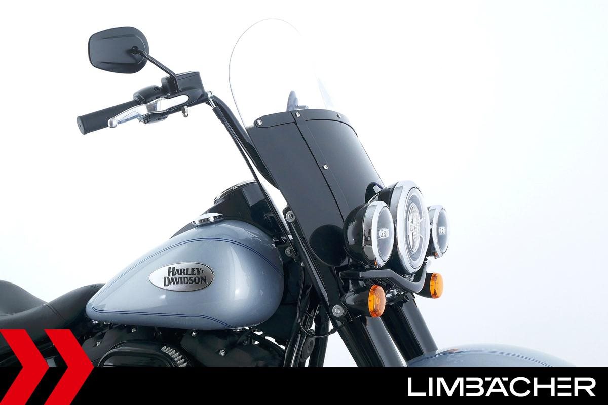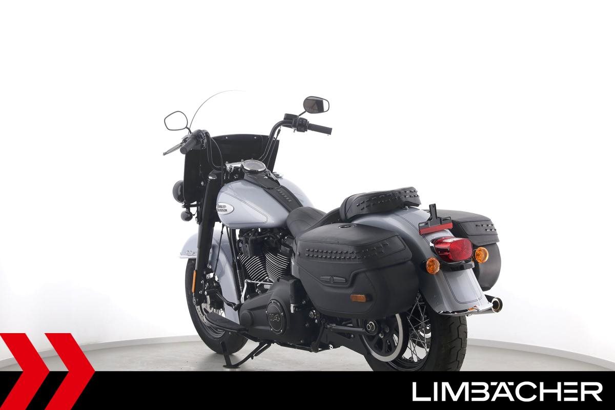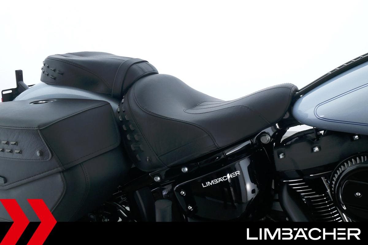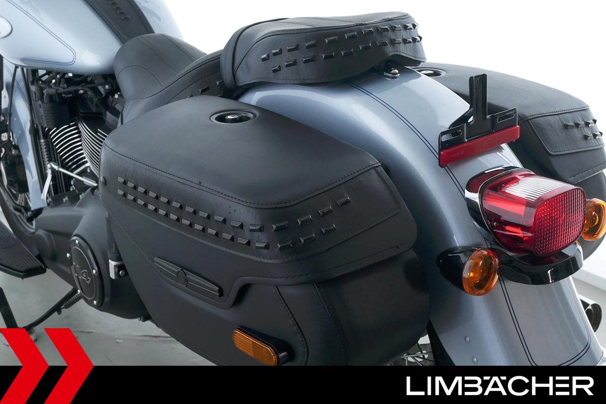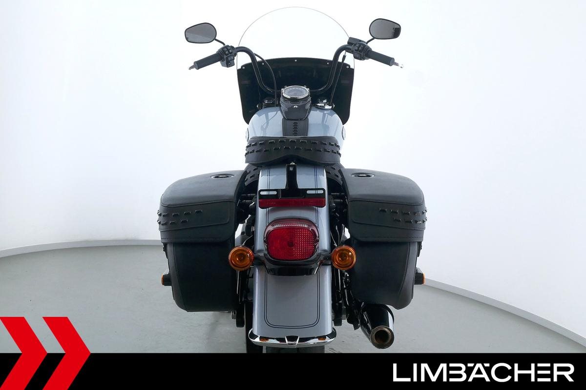 Eine scheckheftgepflegte Harley-Davidson Heritage Softail Classic FLHCS aus zweiter Hand in neuwertigem Zustand u.a. mit HD-Lederkoffer-System gleichschließend sowie großer Classic-Scheibe.