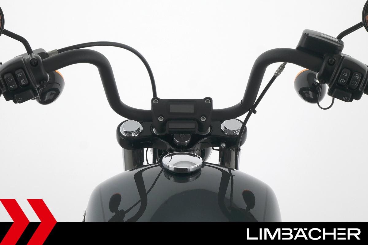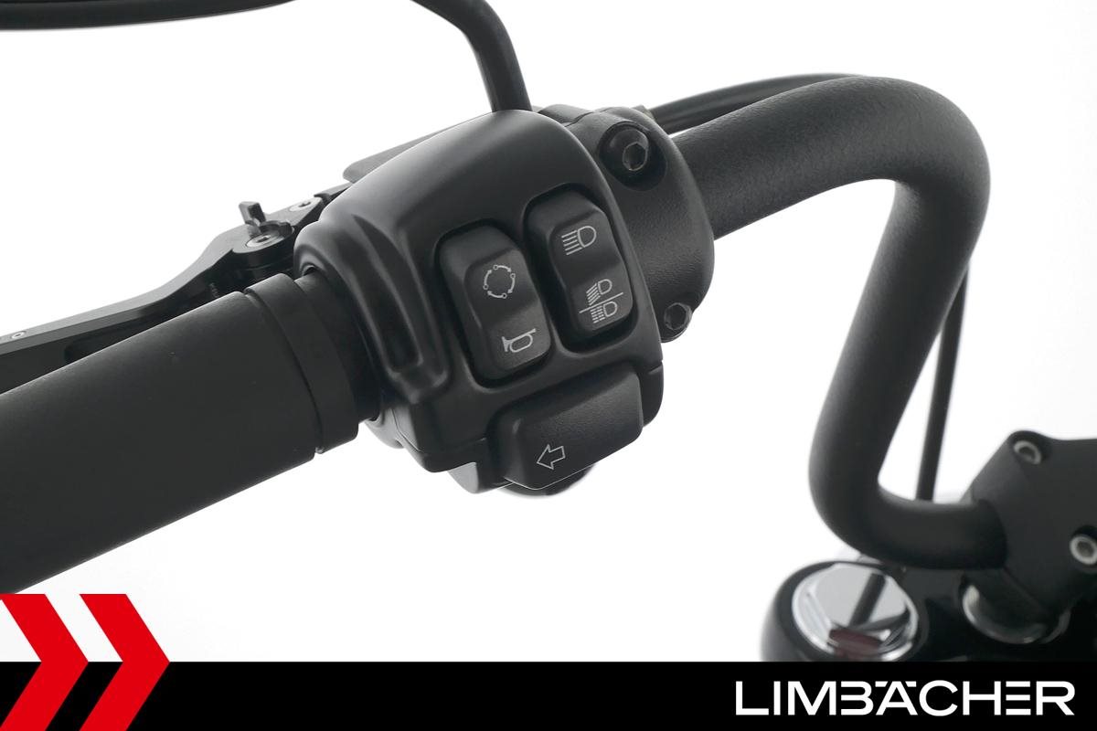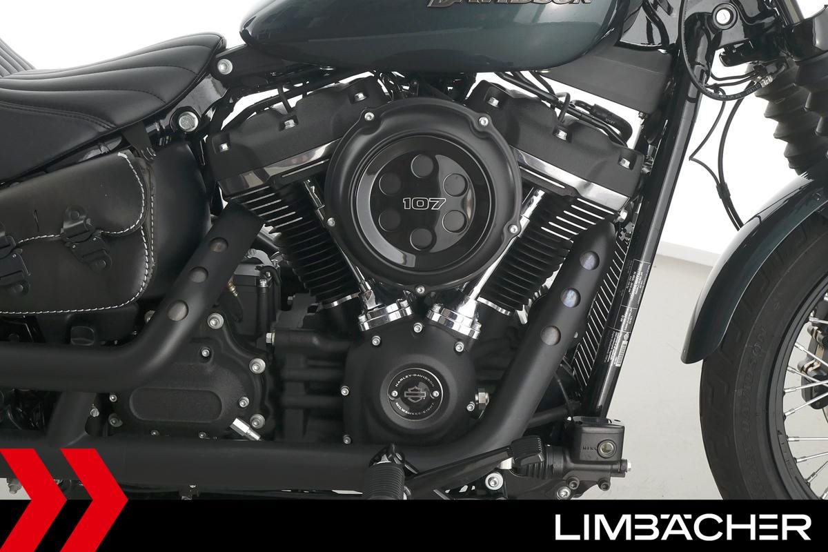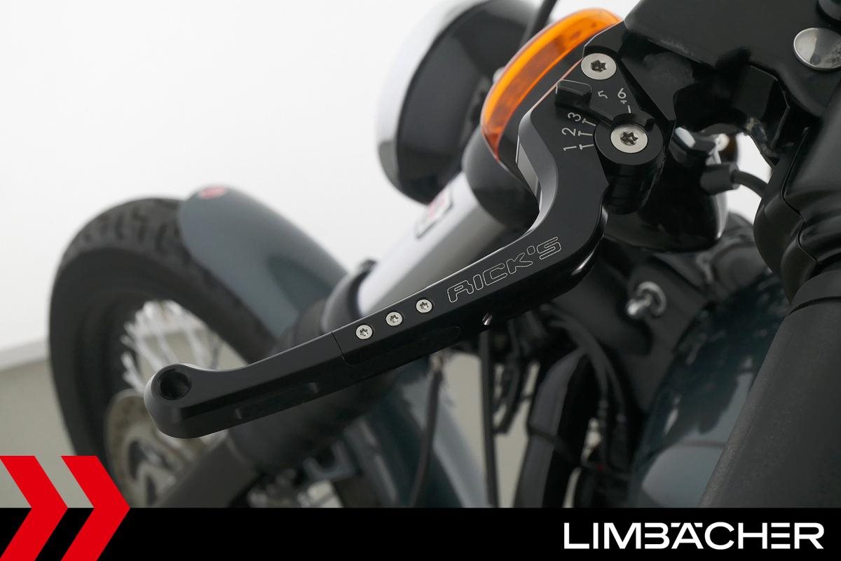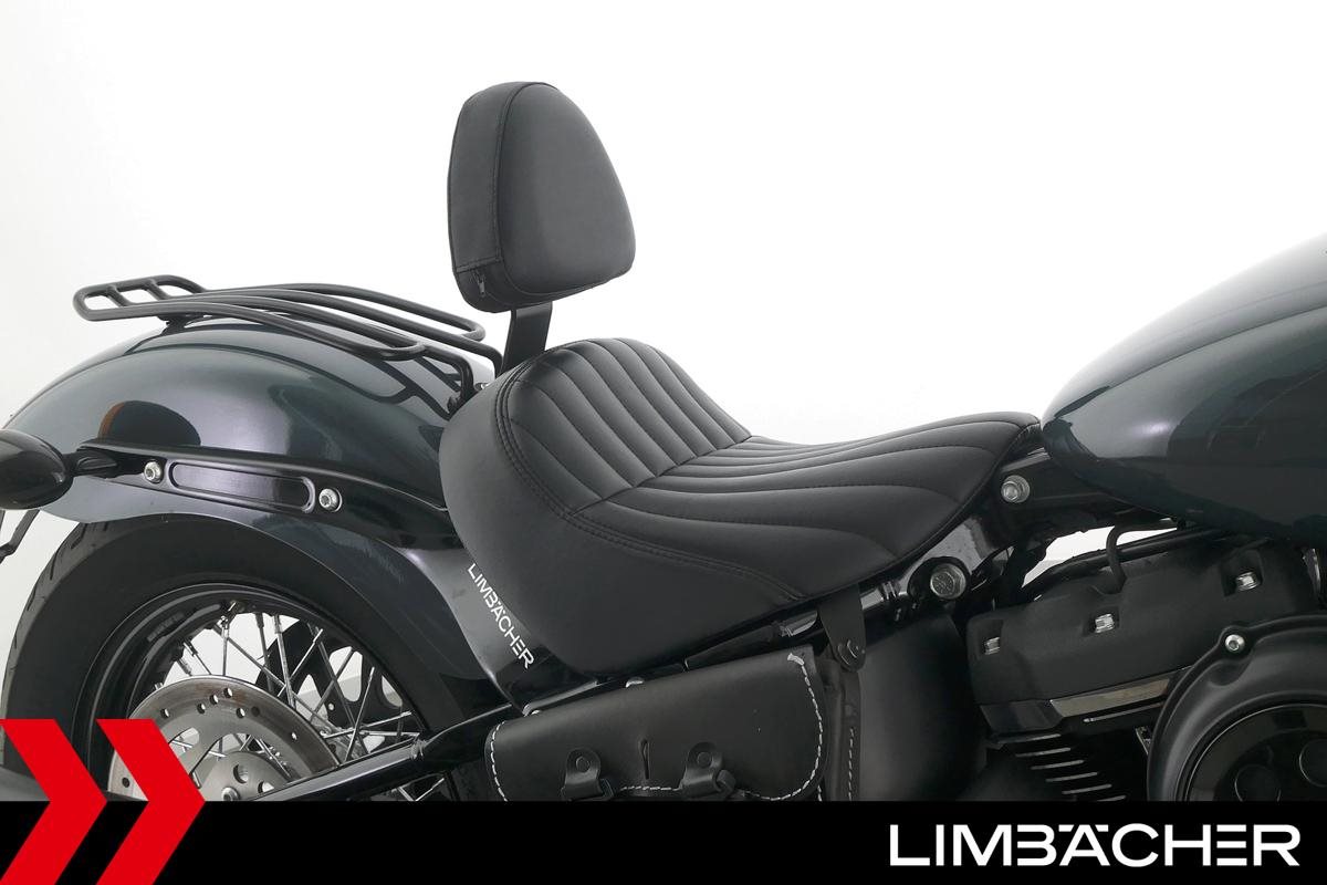 Eine scheckheftgepflegte Harley-Davidson Softail Street Bob FXBB aus zweiter Hand in sehr gepflegtem Zustand u.a. mit kurzem Kennzeichenhalter sowie Rick's-Brems- und -Kupplungshebel.