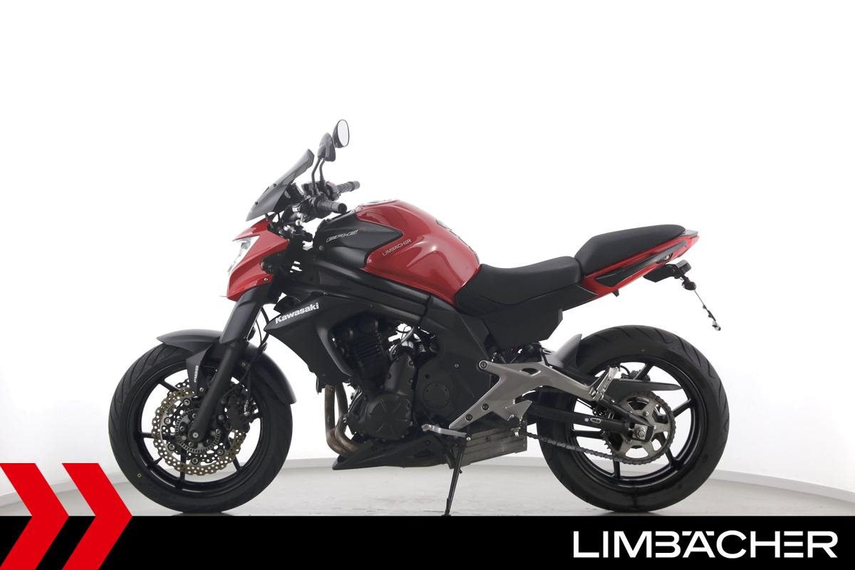 Eine scheckheftgepflegte Kawasaki ER-6n in gepflegtem Zustand u.a. mit kurzem Kennzeichenhalter sowie Ganganzeige.