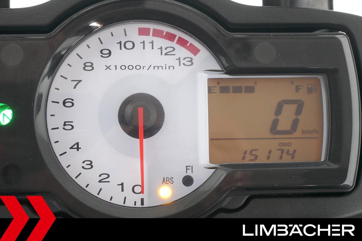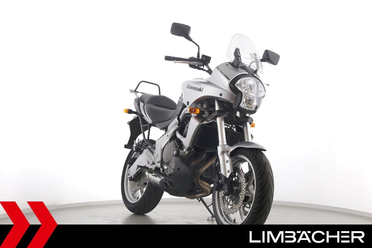 Eine Kawasaki Versys 650 in gepflegtem Zustand u.a. mit Drosselung auf 35 kW und Hepco & Becker-Gepäckträger.