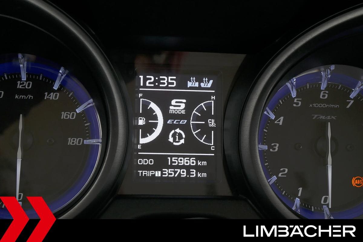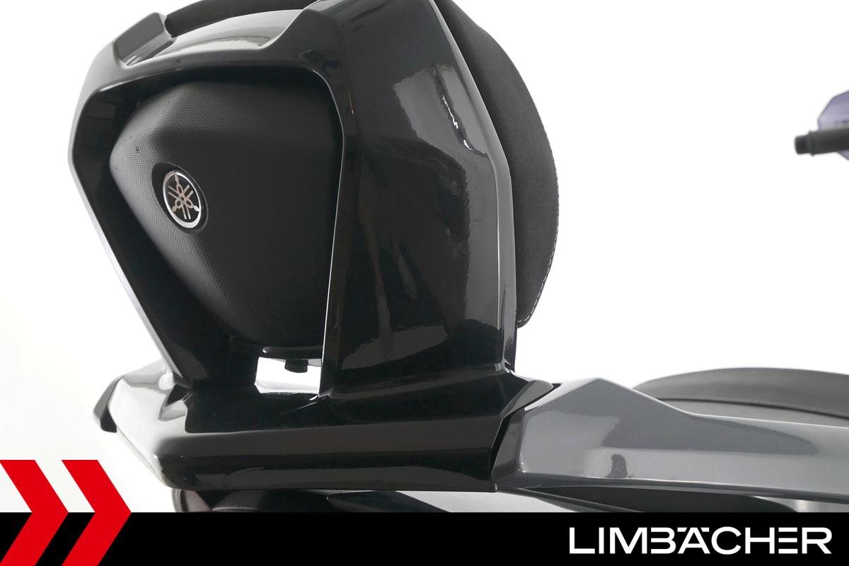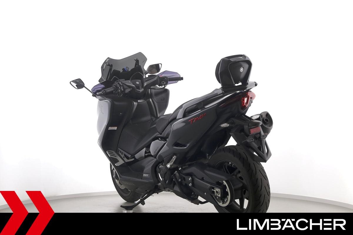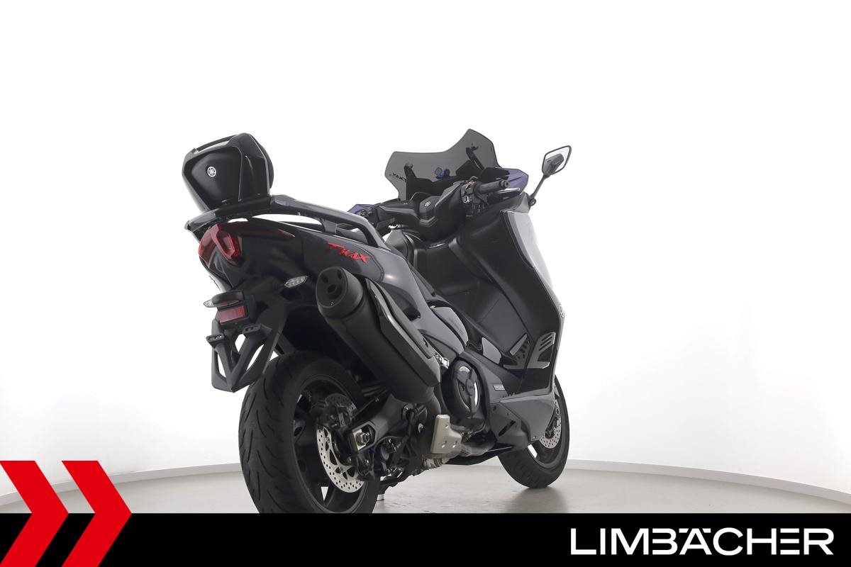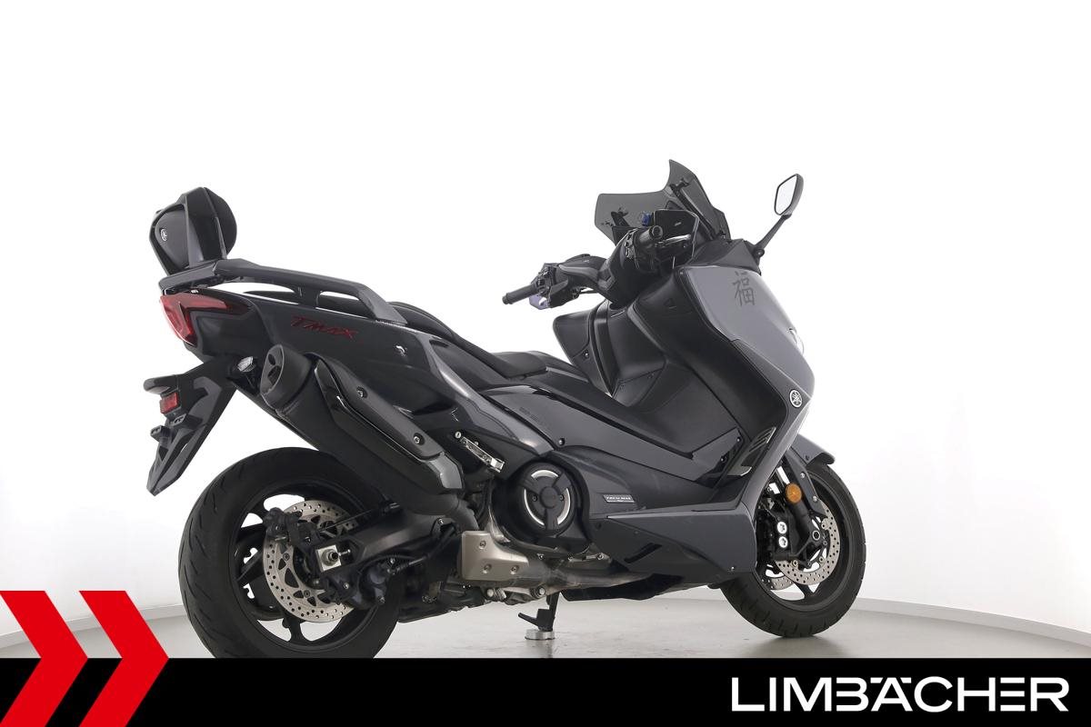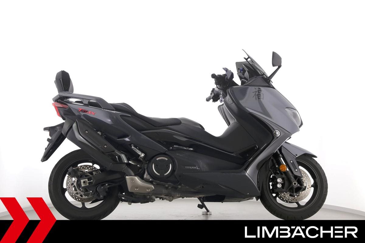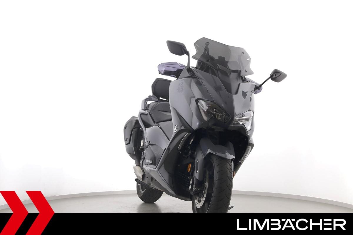 Eine scheckheftgepflegte Yamaha TMAX 560 Tech Max aus zweiter Hand in gepflegtem Zustand u.a. mit Yamaha-Sportscheibe und Yamaha-Rückenlehne.