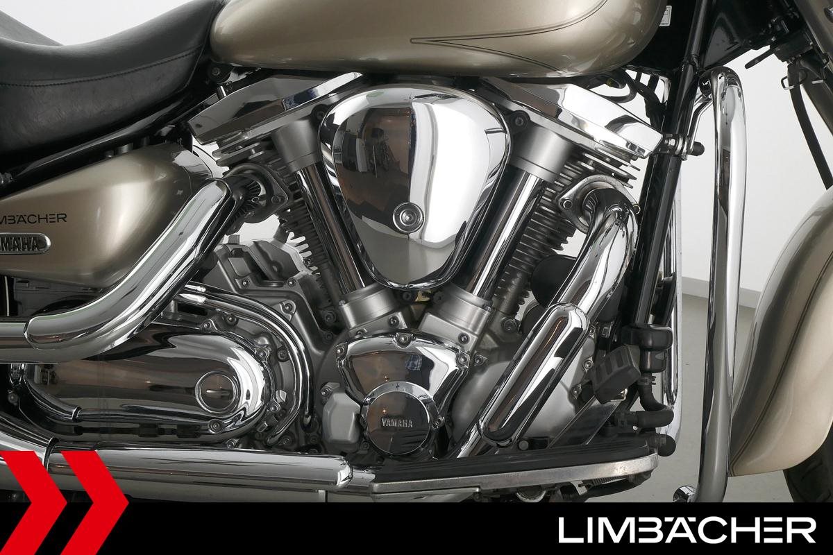 Eine Yamaha XV 1600 Wild Star in gepflegtem Zustand u.a. mit Sturzbügel sowie großem Touring-Windschild.