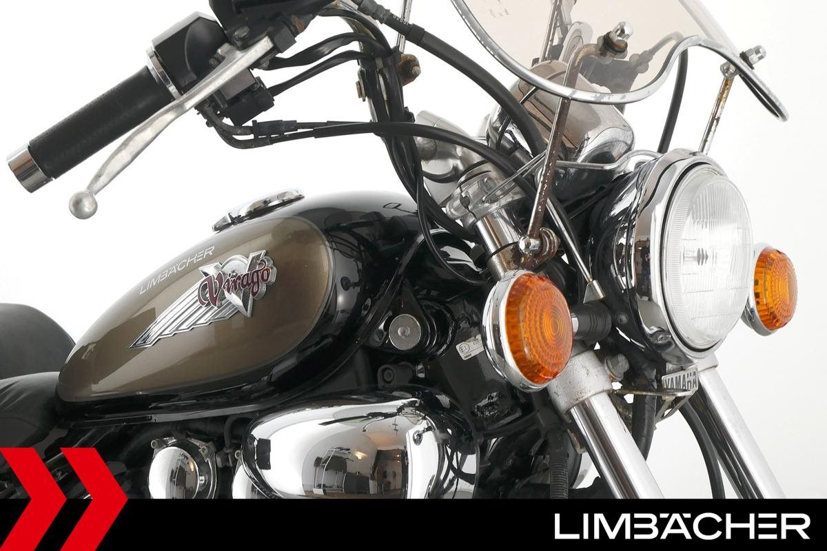 Eine Yamaha XV 535 Virago in gebrauchtem Zustand mit Windschild und Satteltaschen.