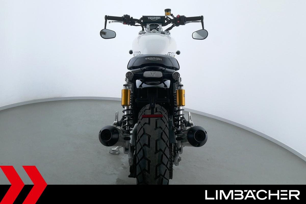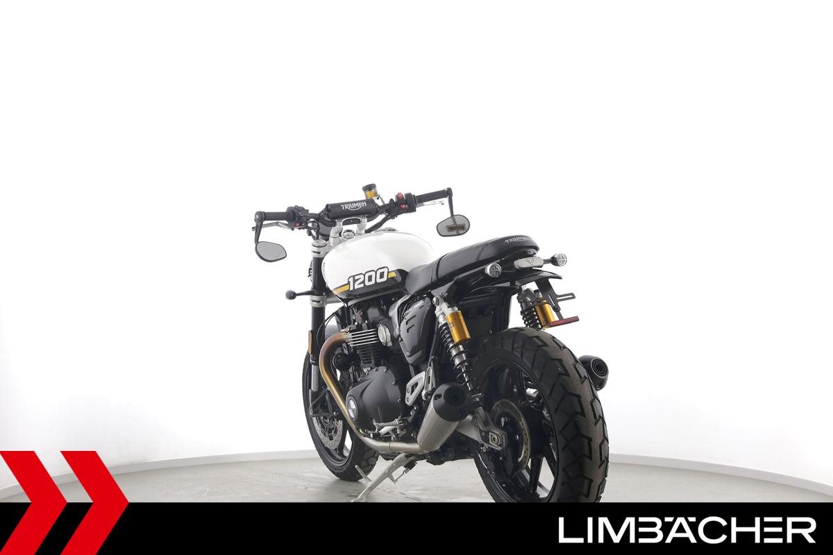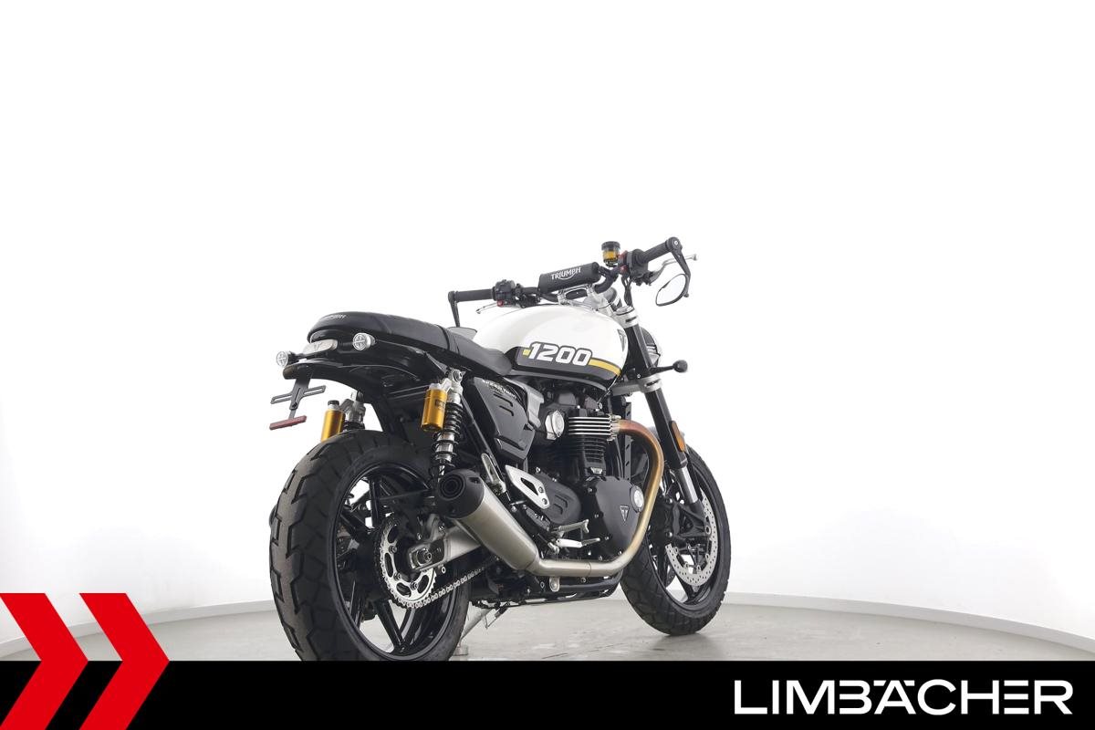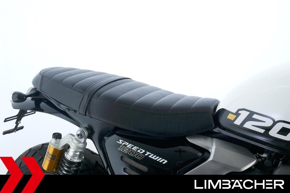 Eine neue Triumph Speed Twin 1200 u.a. mit kurzem Kennzeichenhalter sowie Öhlins-Stoßdämpfer hinten.