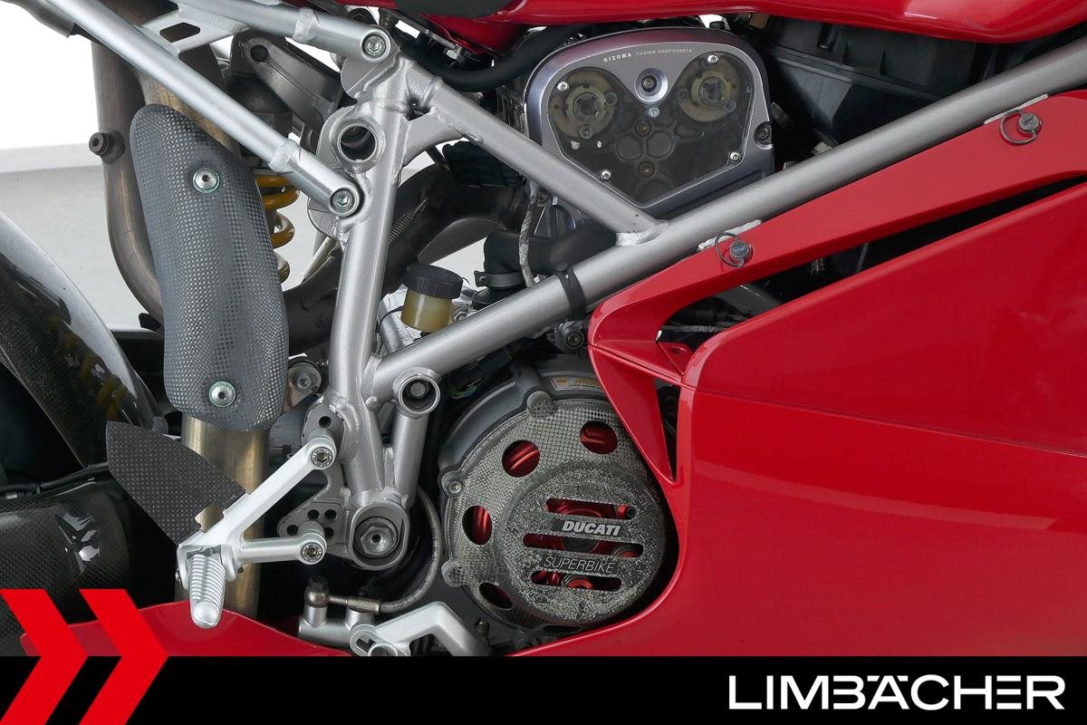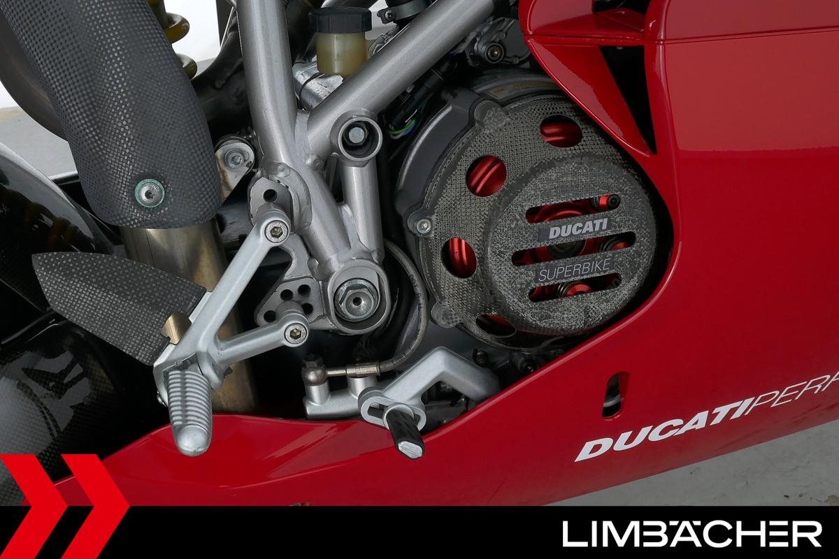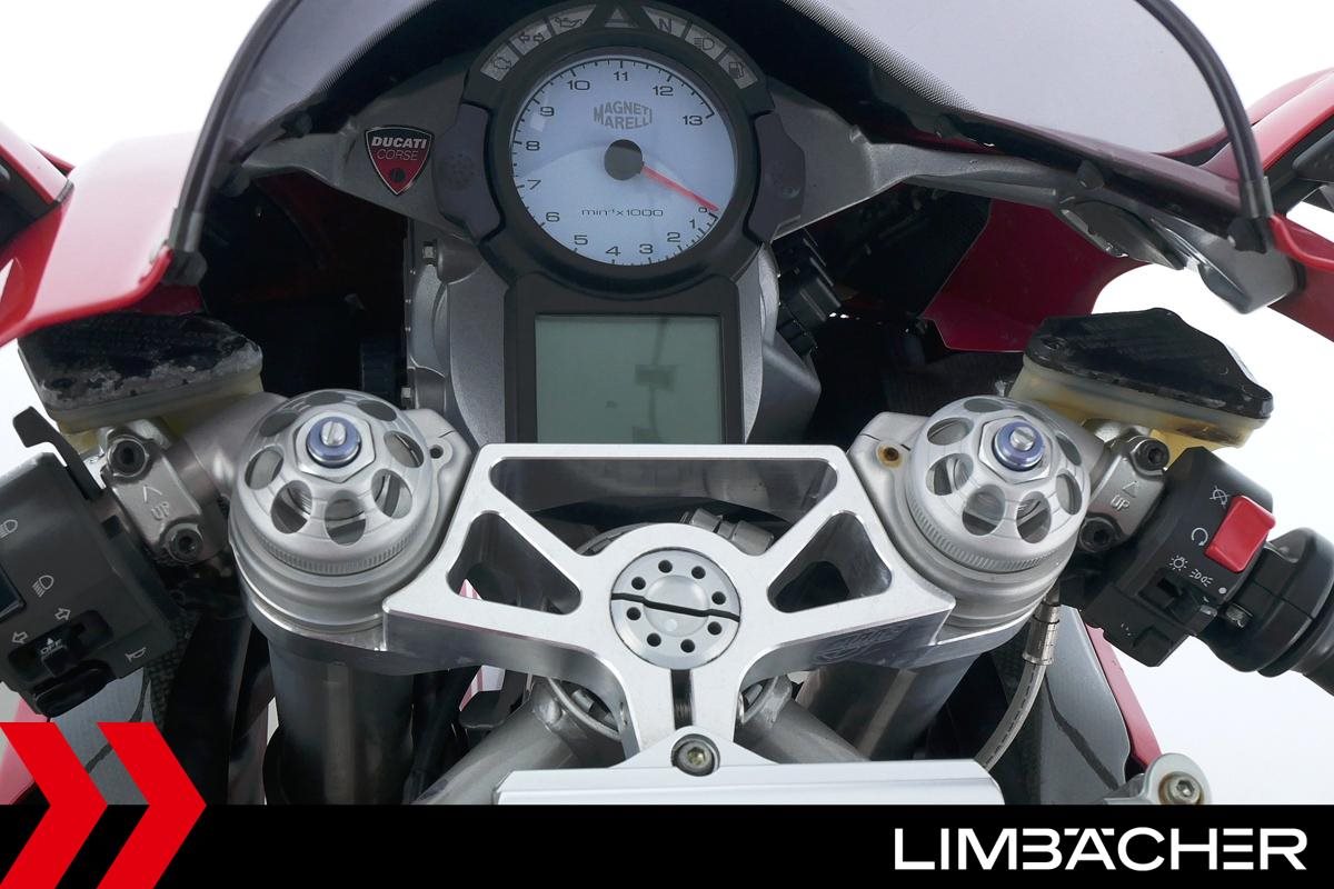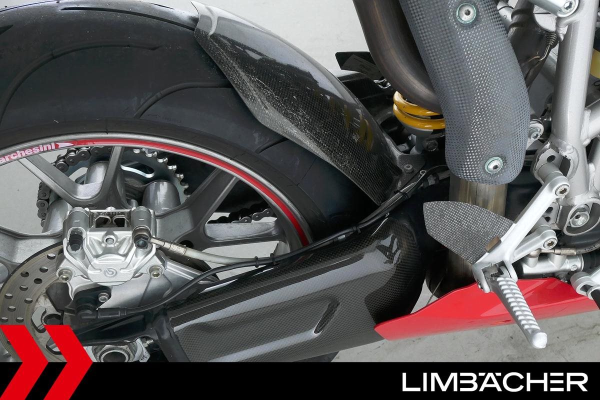 Eine Ducati 999 in gebrauchtem Zustand u.a. mit Rizoma-Riemenabdeckungen transparent sowie Carbon-Spritzschutz hinten und -Cockpitverkleidung.