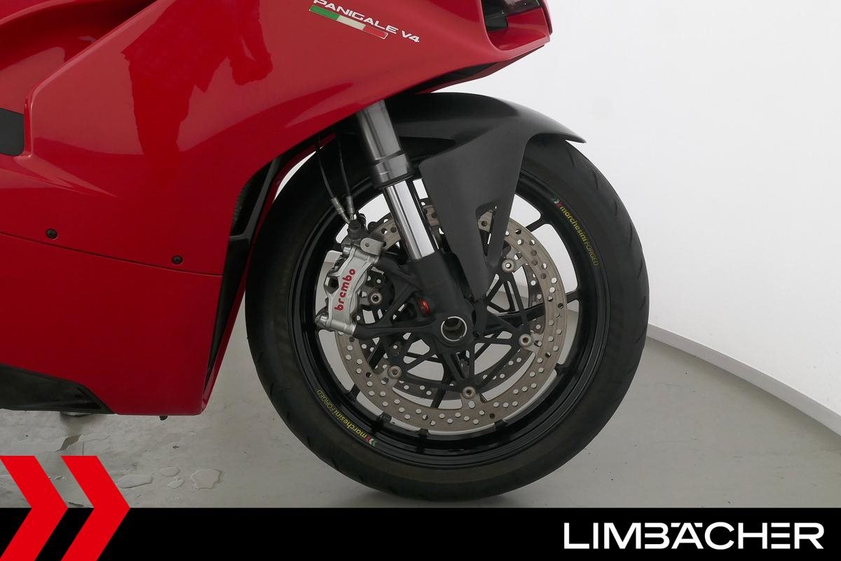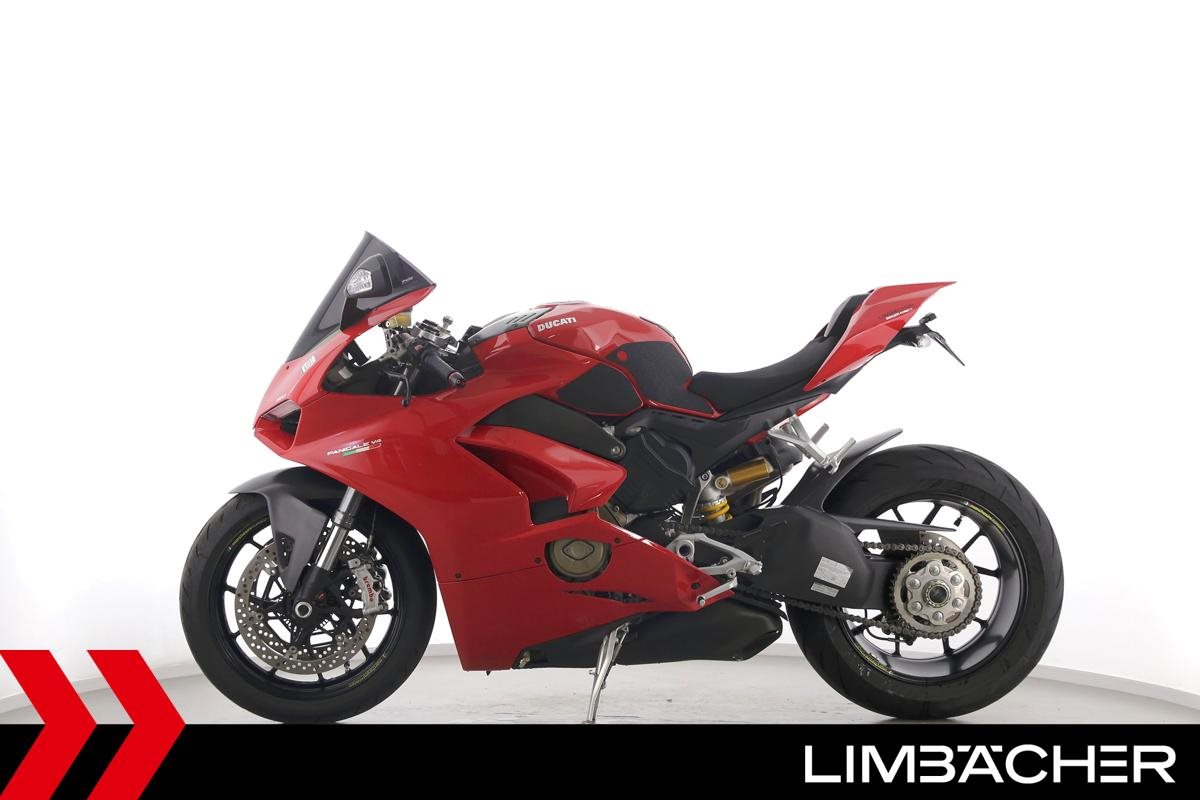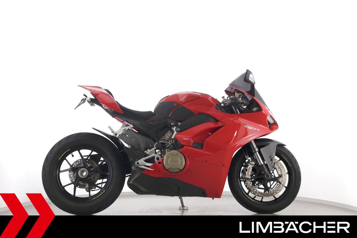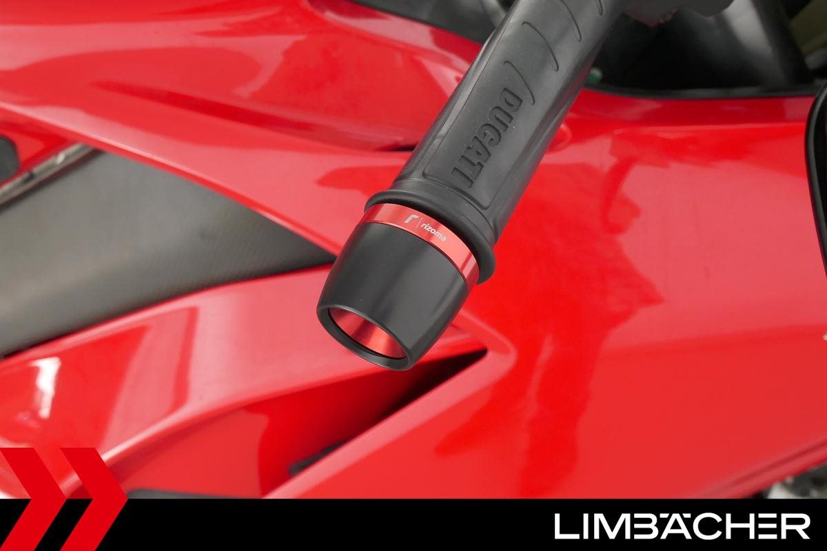 Eine scheckheftgepflegte Ducati Panigale V4 aus zweiter Hand in gepflegtem Zustand u.a. mit kurzem Kennzeichenhalter sowie Carbon-Front- und -Heckfender.