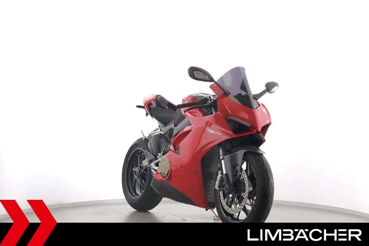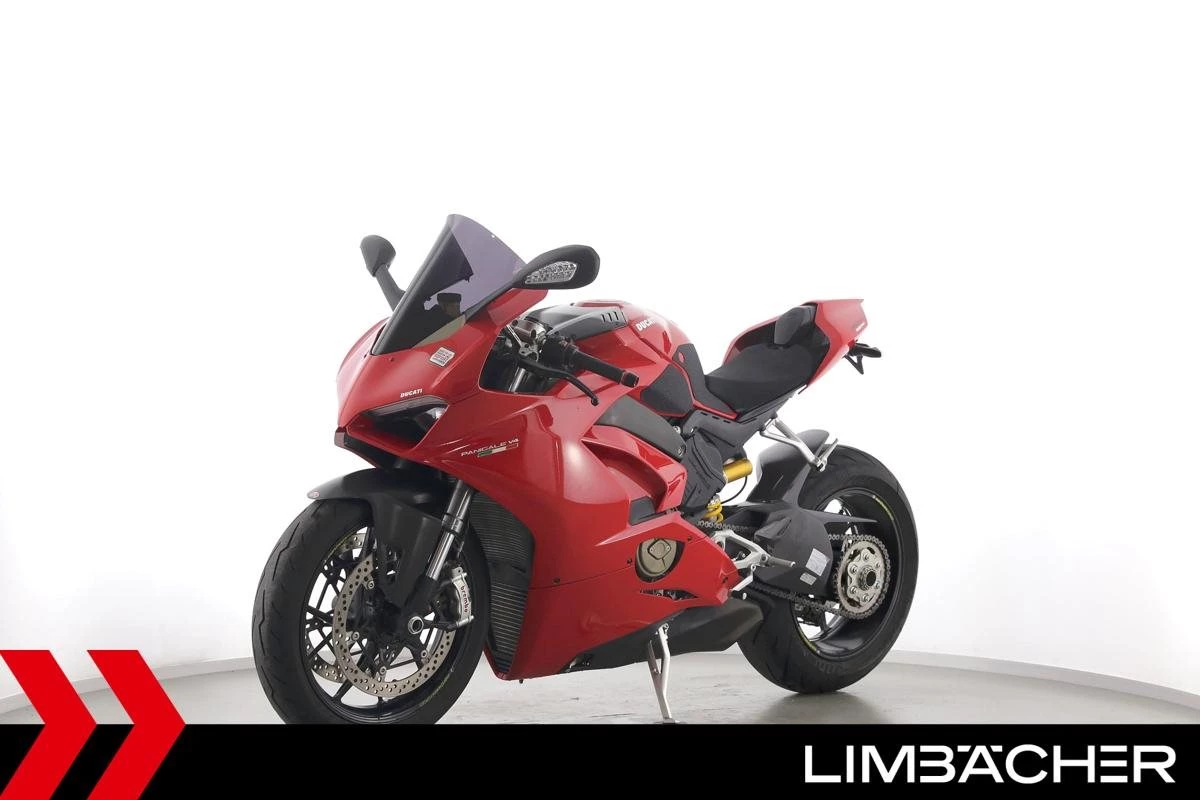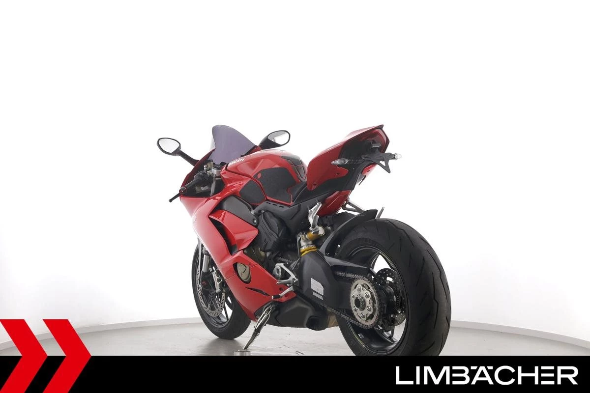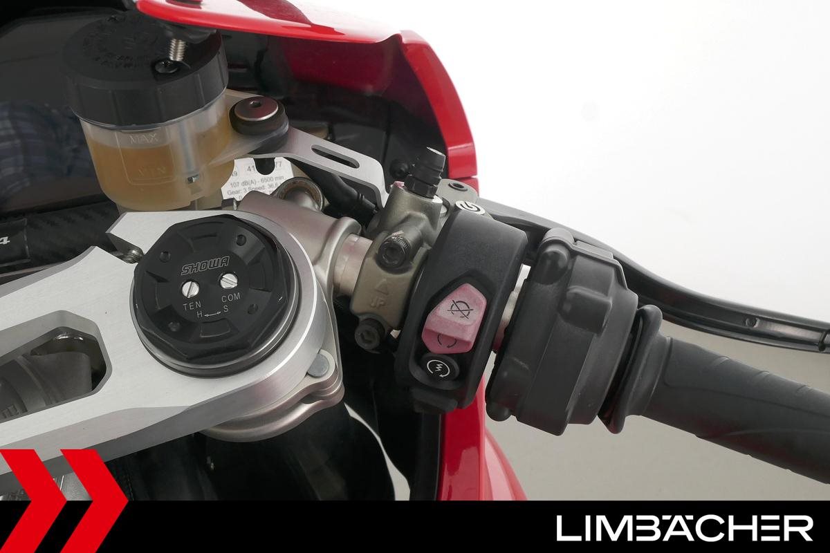 Eine scheckheftgepflegte Ducati Panigale V4 aus zweiter Hand in gepflegtem Zustand u.a. mit kurzem Kennzeichenhalter sowie Carbon-Front- und -Heckfender.