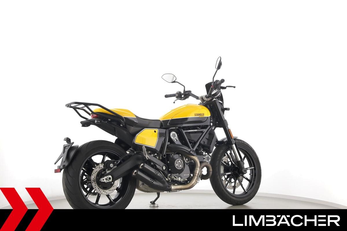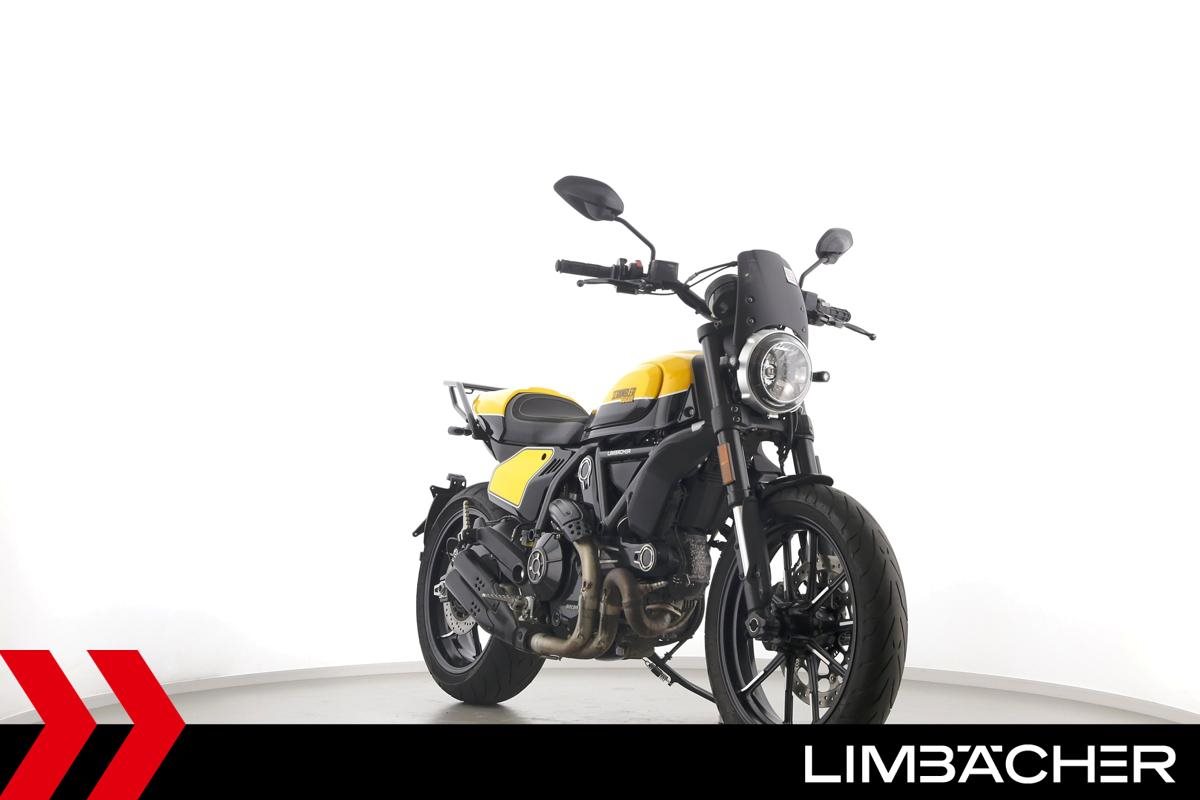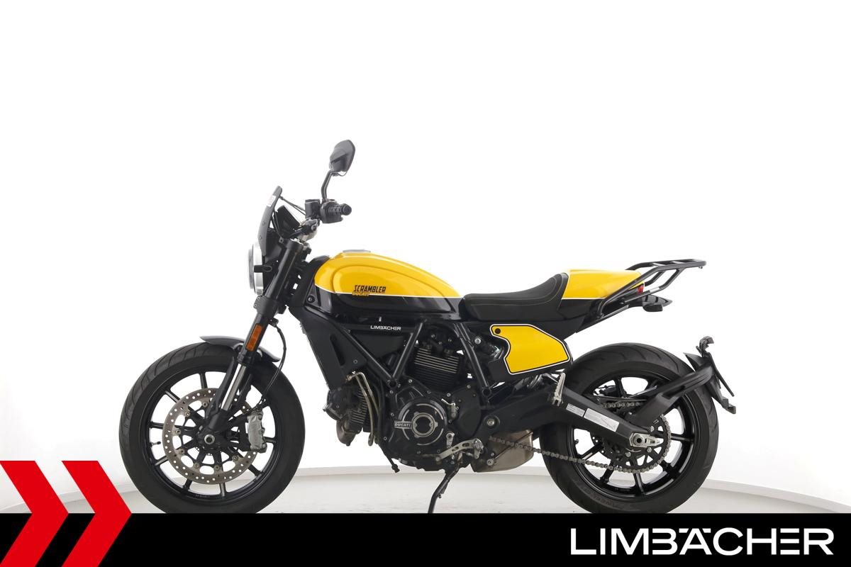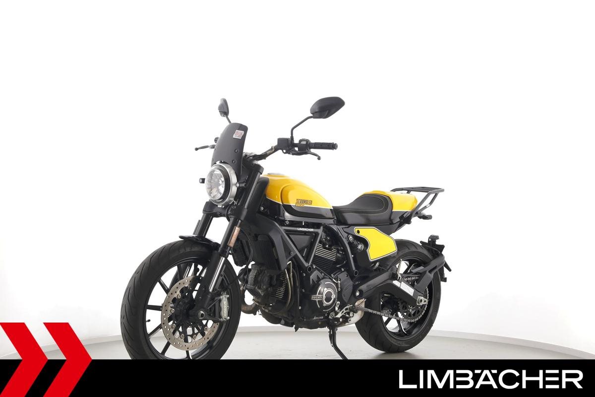 Eine Ducati Scrambler Full Throttle in gepflegtem Zustand u.a. mit Gepäckträger und Windschild.