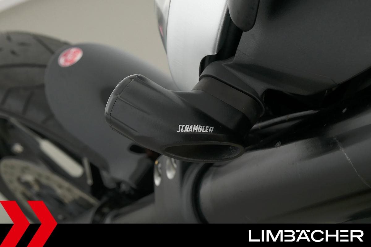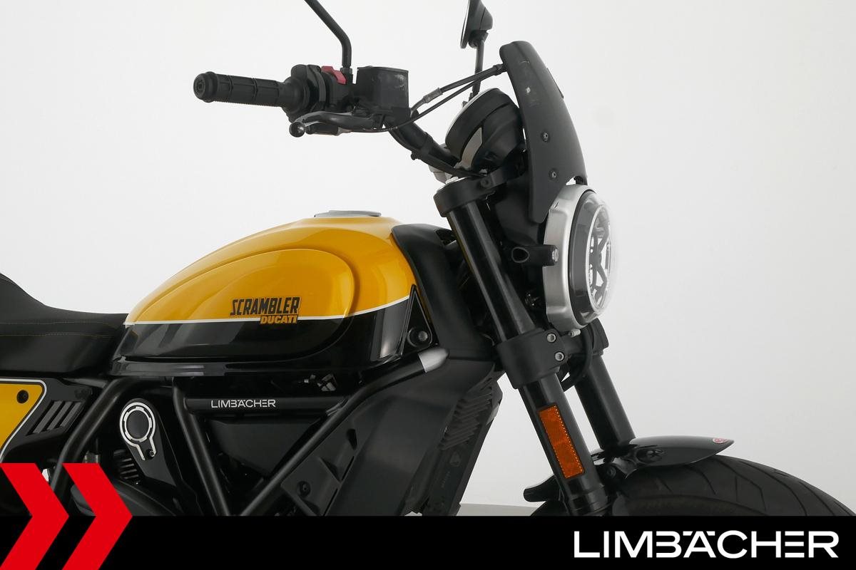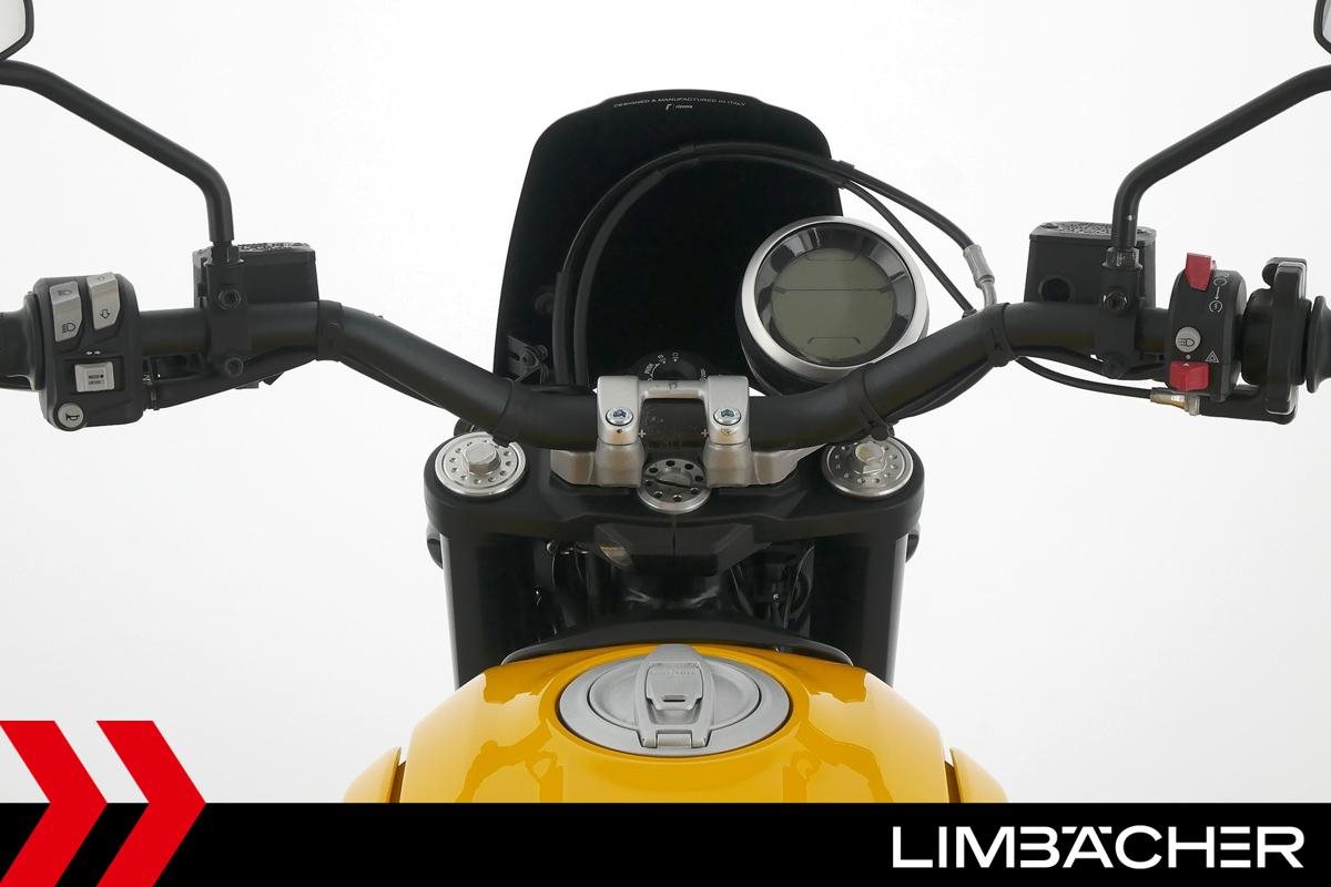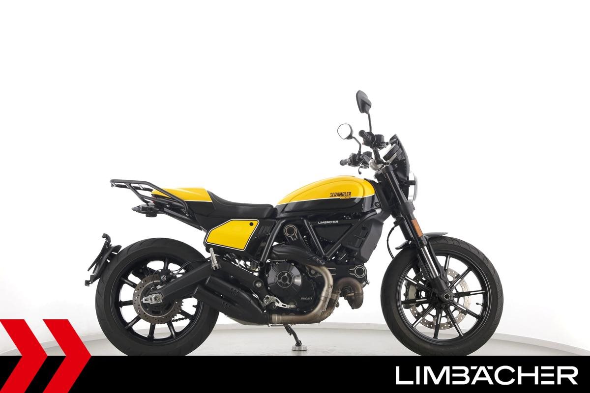 Eine Ducati Scrambler Full Throttle in gepflegtem Zustand u.a. mit Gepäckträger und Windschild.
