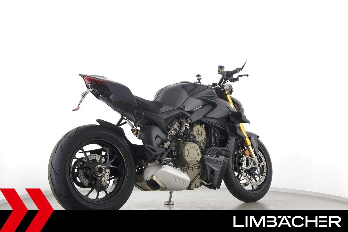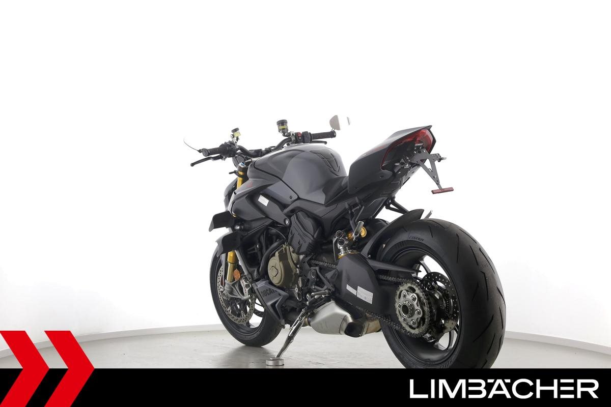 Eine Ducati Streetfighter V4 S aus erster Hand in sehr gepflegtem Zustand u.a. mit kurzem Kennzeichenhalter und Mini-LED-Blinkern.