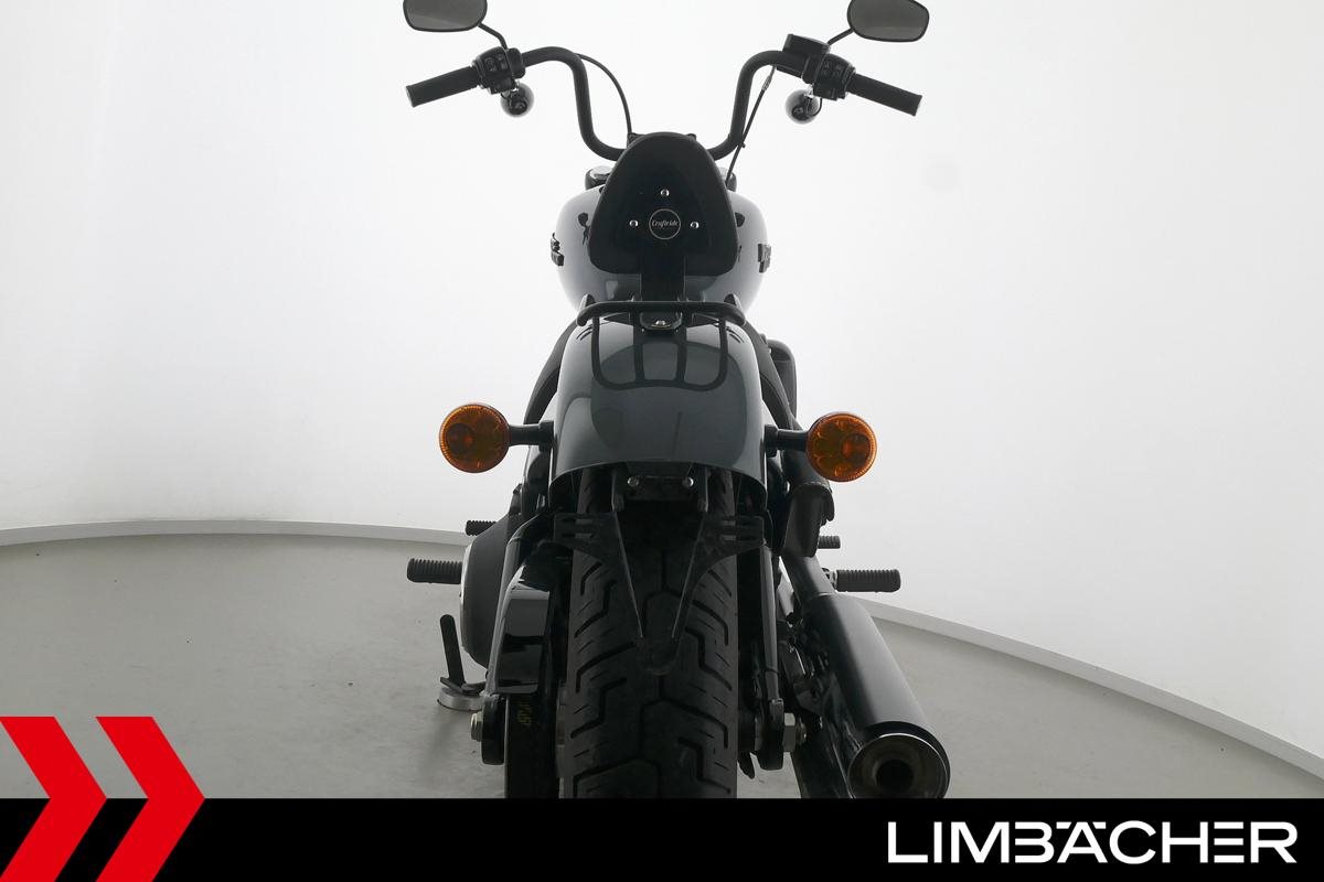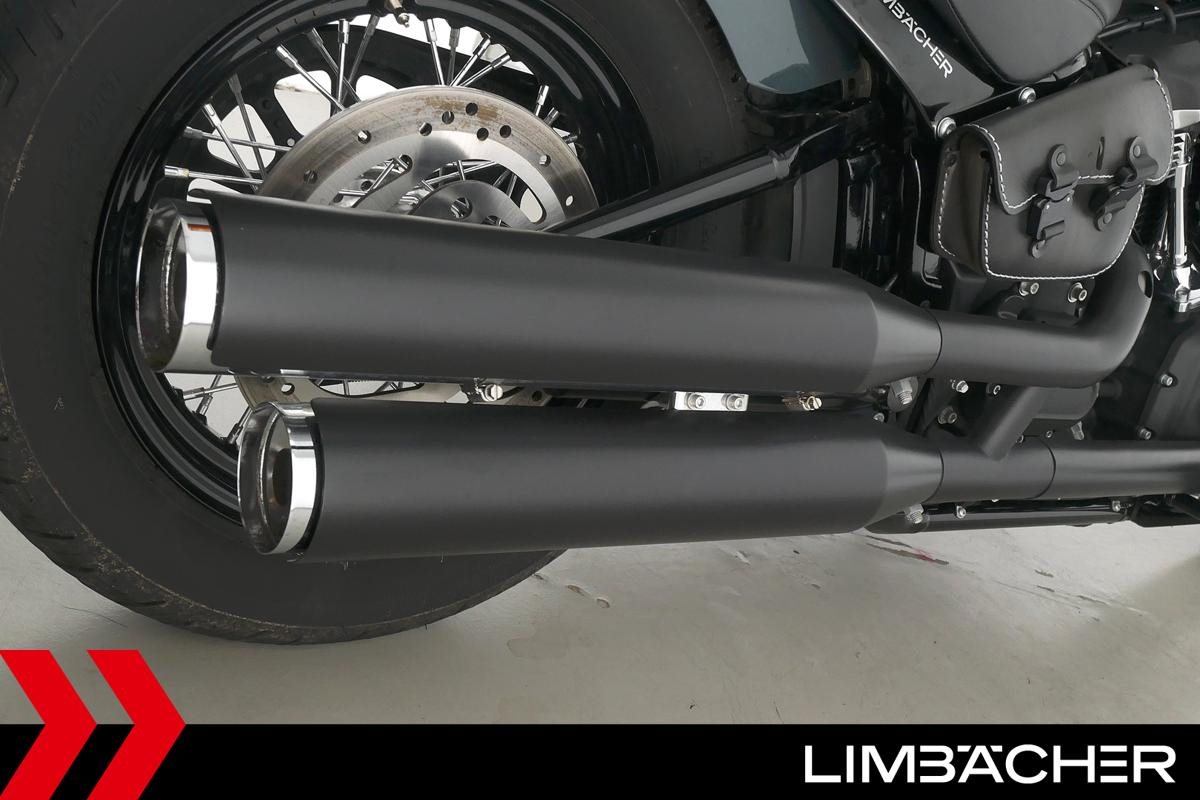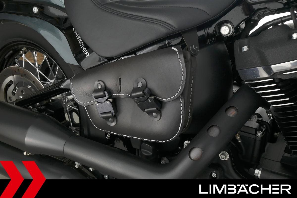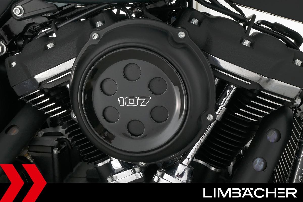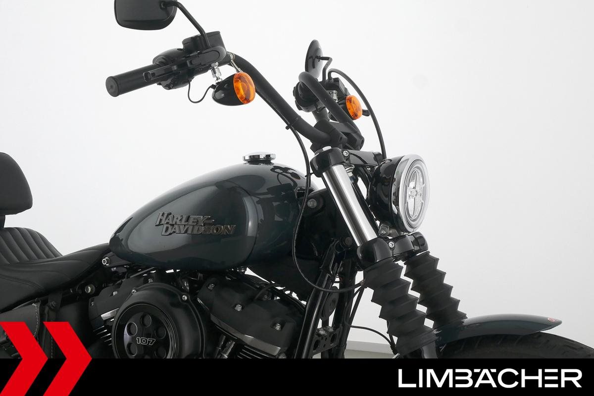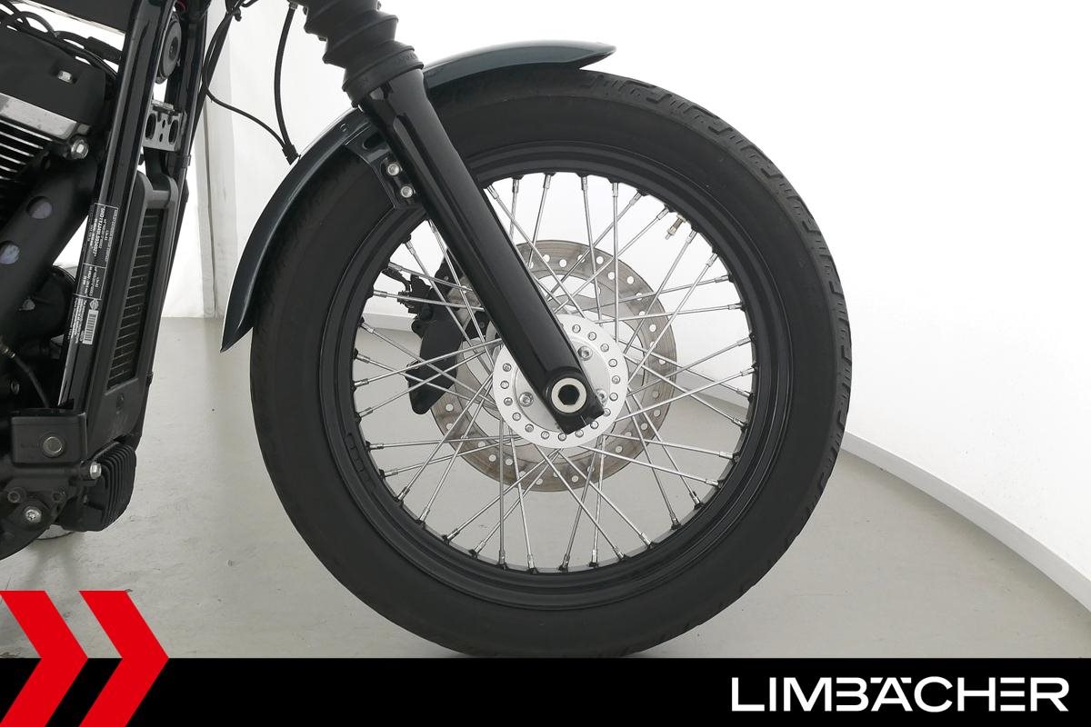 Eine scheckheftgepflegte Harley-Davidson Softail Street Bob FXBB aus zweiter Hand in sehr gepflegtem Zustand u.a. mit kurzem Kennzeichenhalter sowie Rick's-Brems- und -Kupplungshebel.