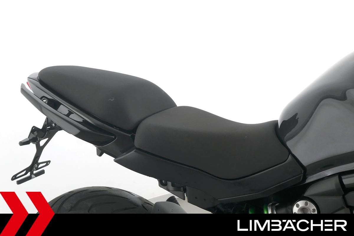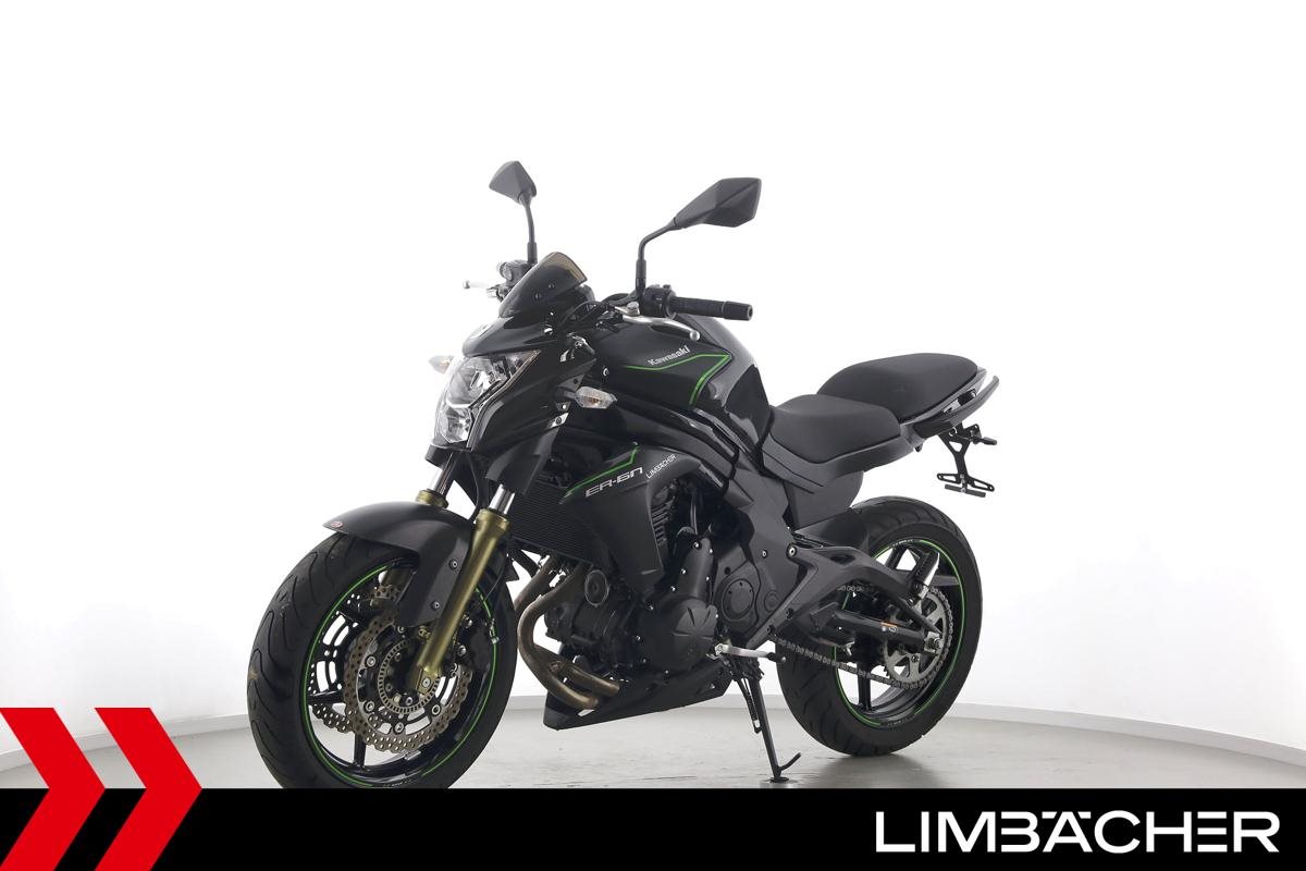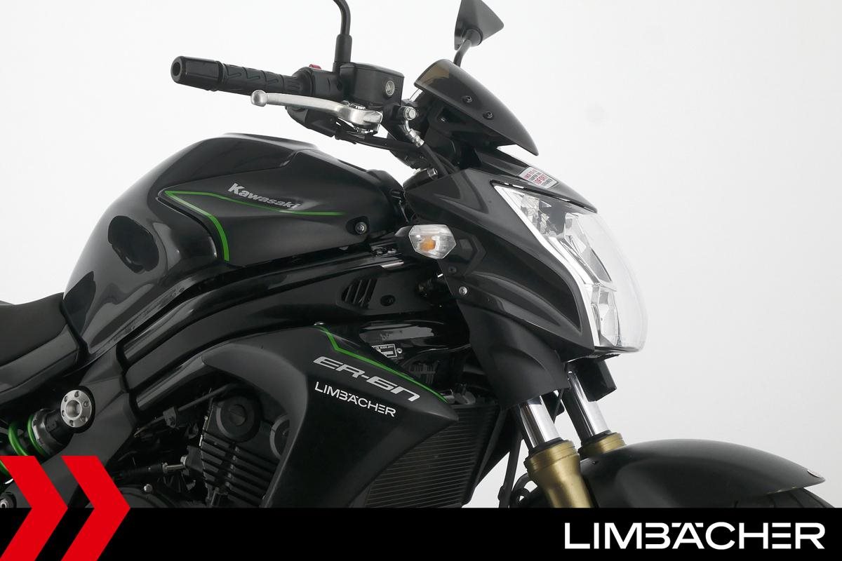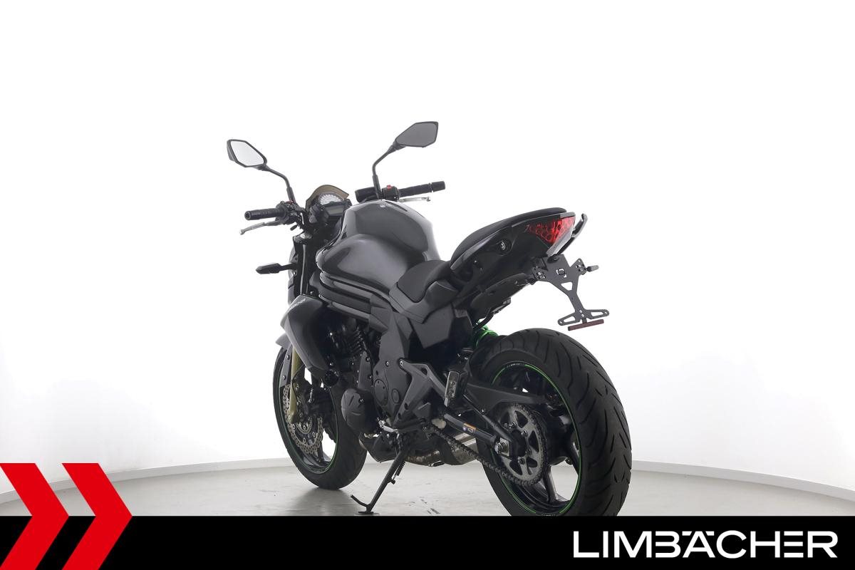 Eine Kawasaki ER-6n in gepflegtem Zustand u.a. mit MIVV-Endschalldämpfer und kurzem Kennzeichenhalter.