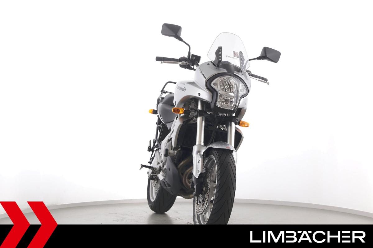 Eine Kawasaki Versys 650 in gepflegtem Zustand u.a. mit Drosselung auf 35 kW und Hepco & Becker-Gepäckträger.