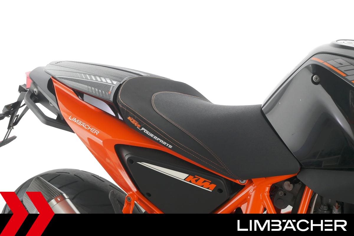 Eine scheckheftgepflegte KTM 690 Duke in gepflegtem Zustand u.a. mit LeoVince-Endschalldämpfer sowie kurzem Kennzeichenhalter.