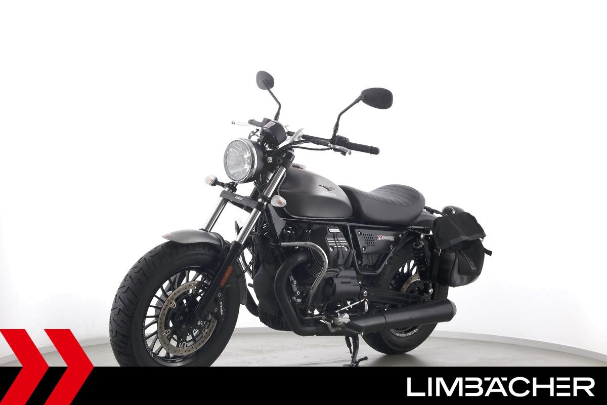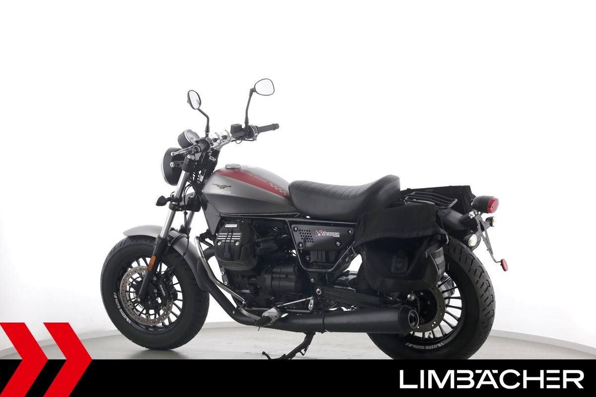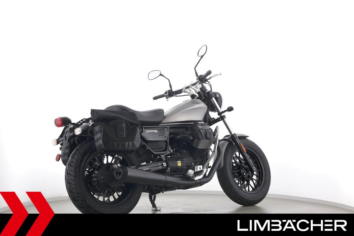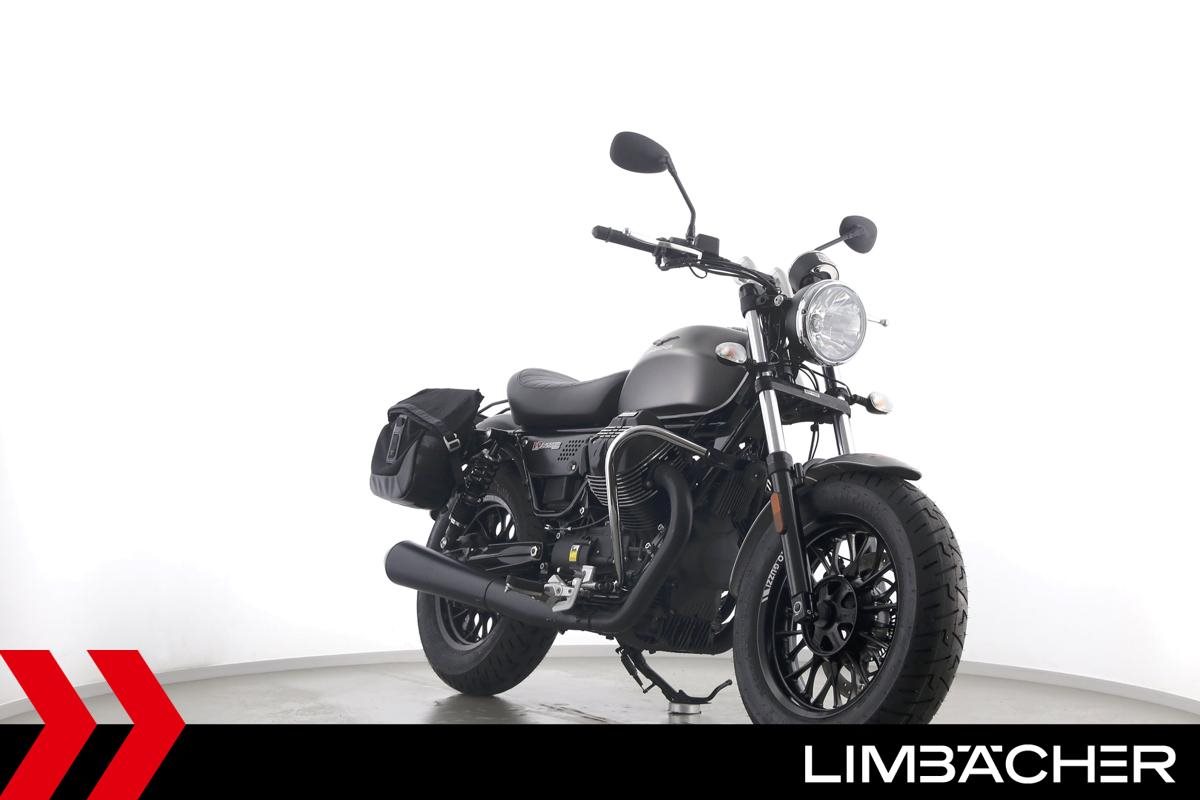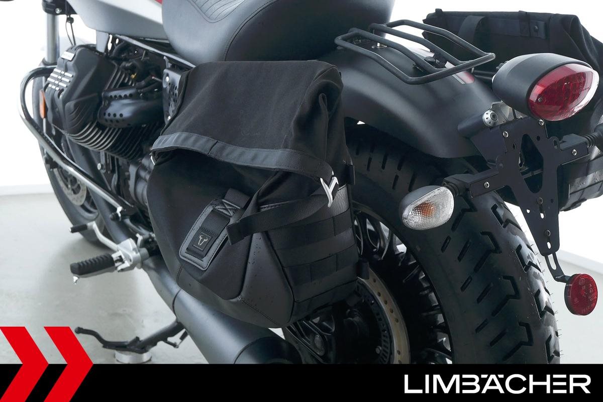 Eine Moto Guzzi V9 Bobber aus zweiter Hand in gepflegtem Zustand u.a. mit Originalausstattung sowie SW-Motech-Canvas-Packtaschen.