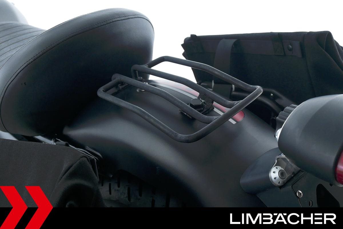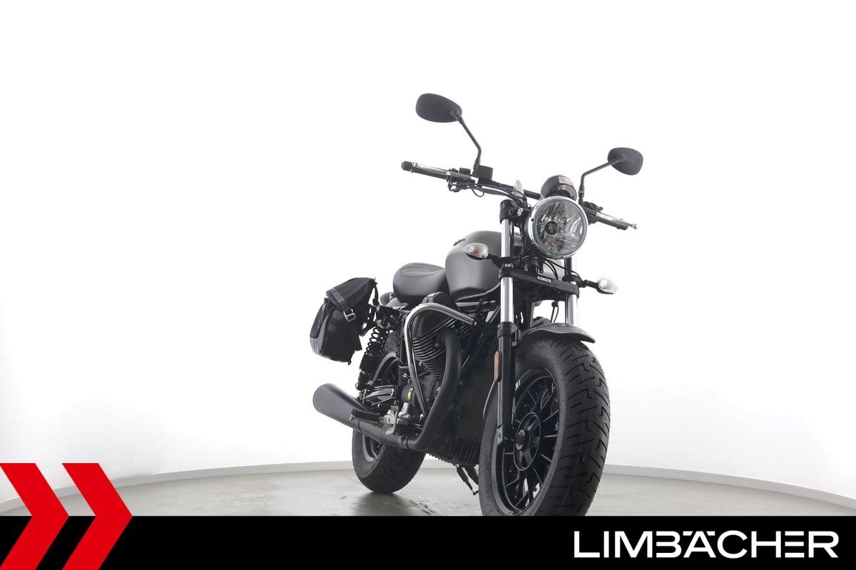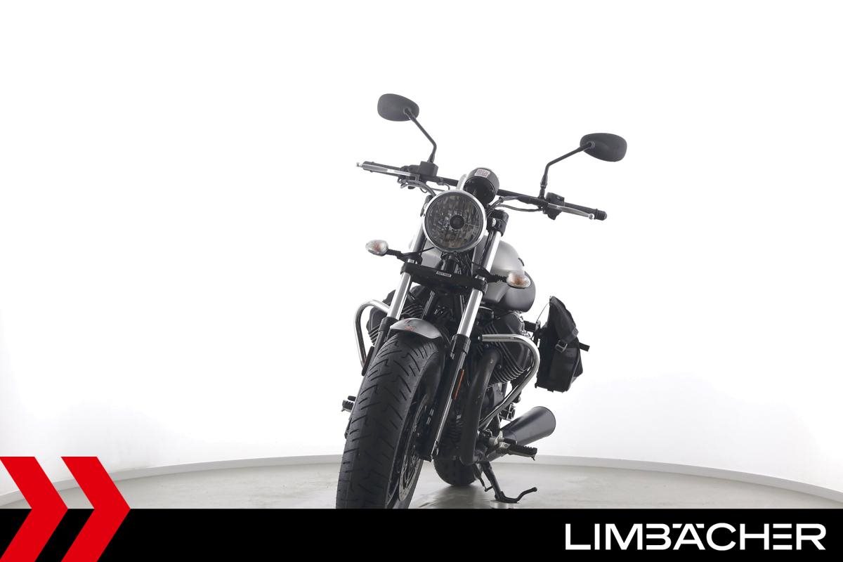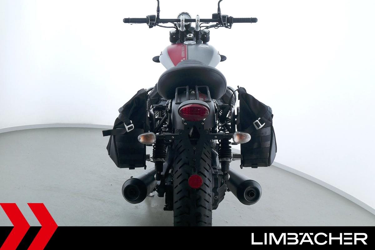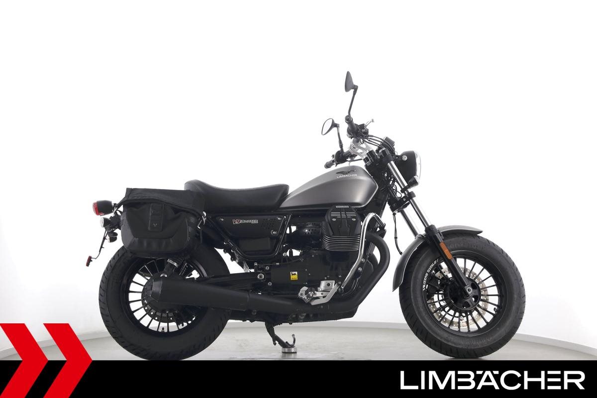 Eine Moto Guzzi V9 Bobber aus zweiter Hand in gepflegtem Zustand u.a. mit Originalausstattung sowie SW-Motech-Canvas-Packtaschen.