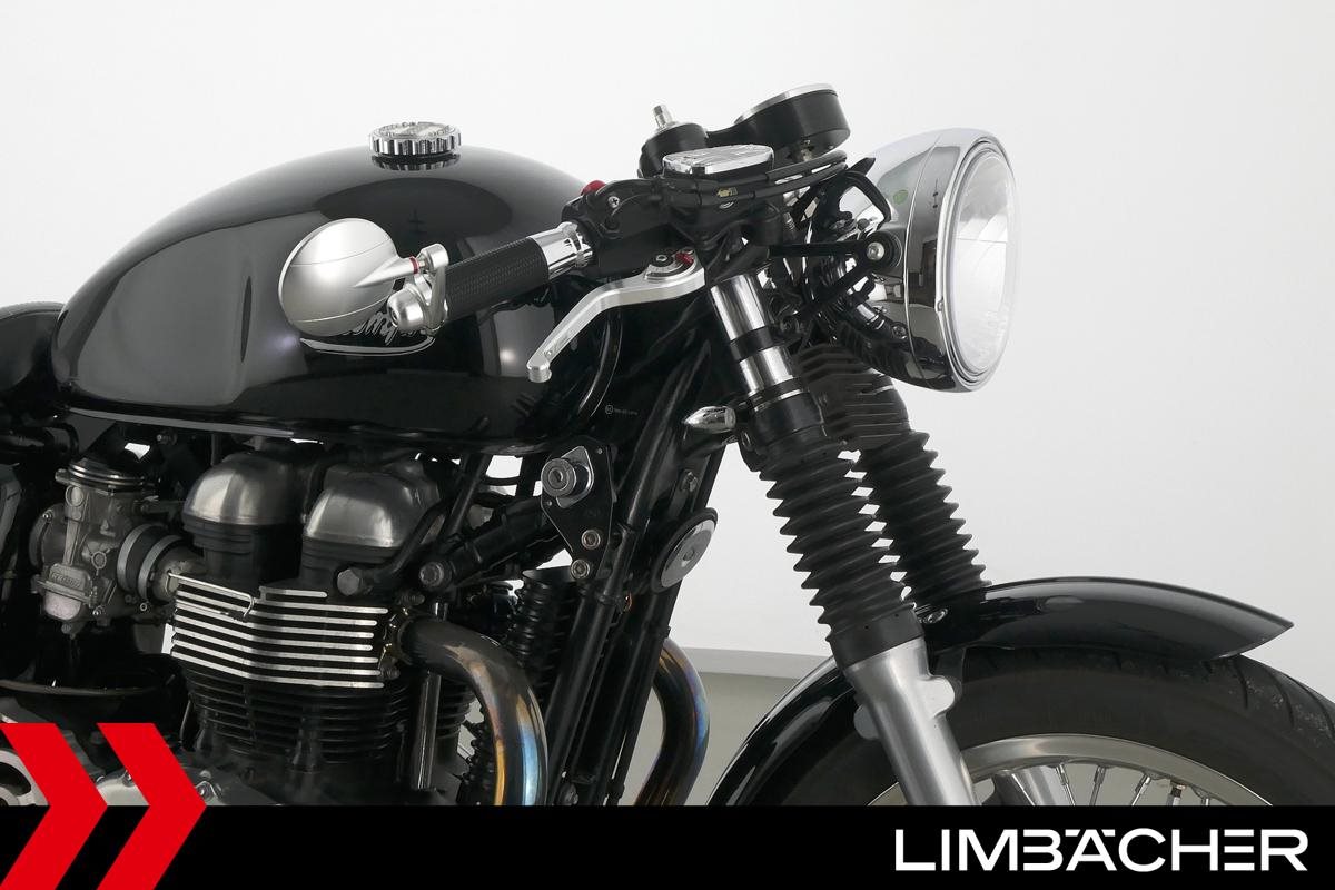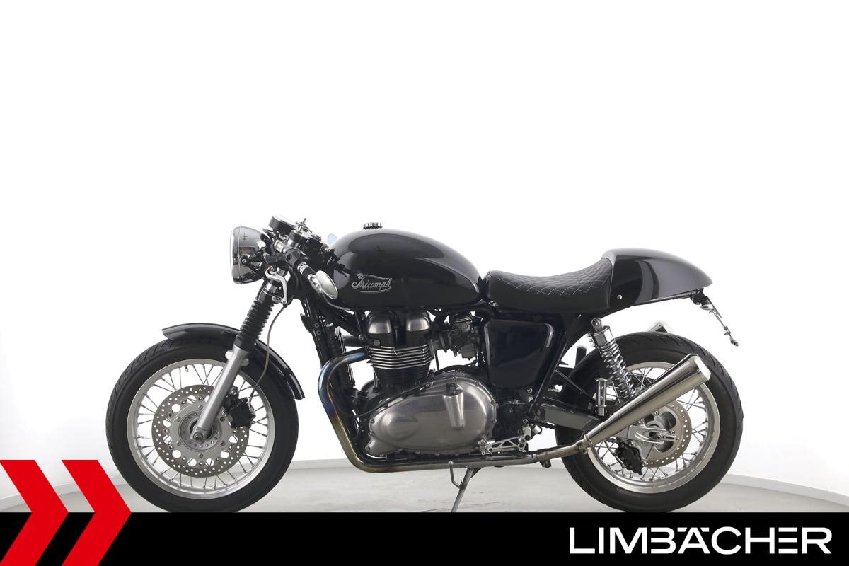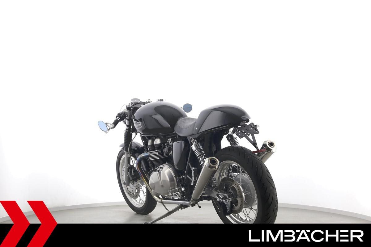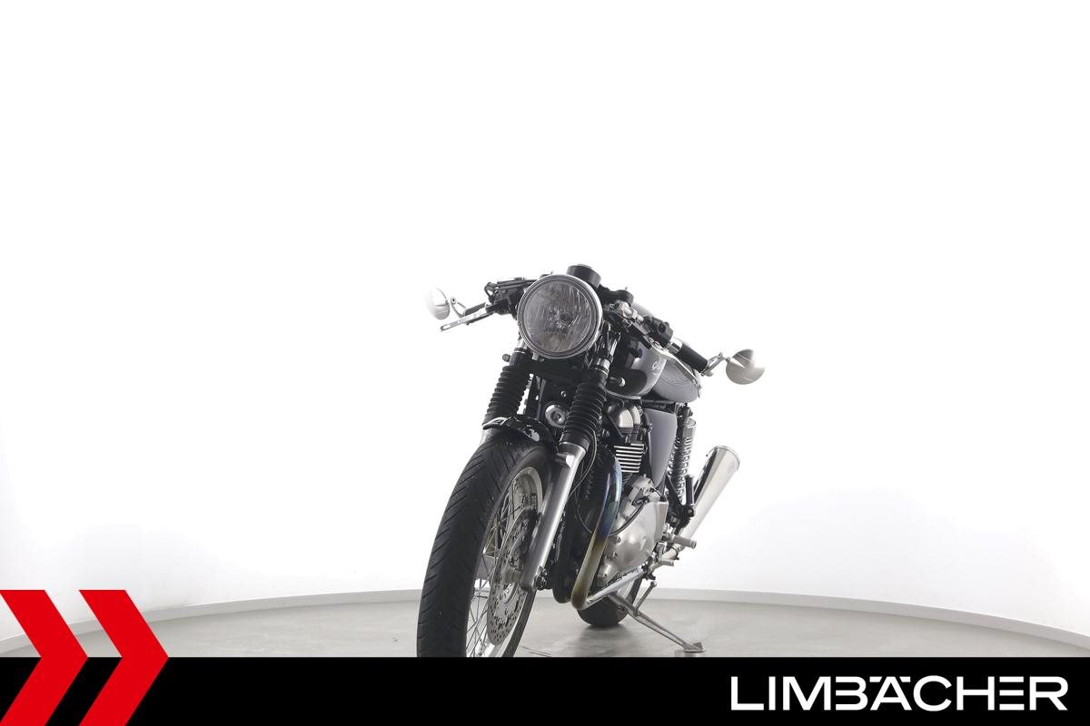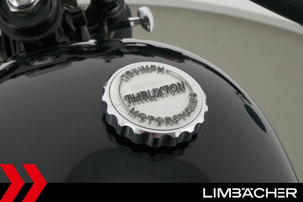Eine Triumph Thruxton in gepflegtem Zustand u.a. mit Lenkerendspiegeln sowie Sonderlenker LSL.