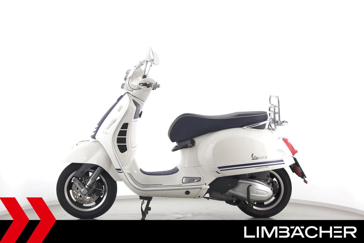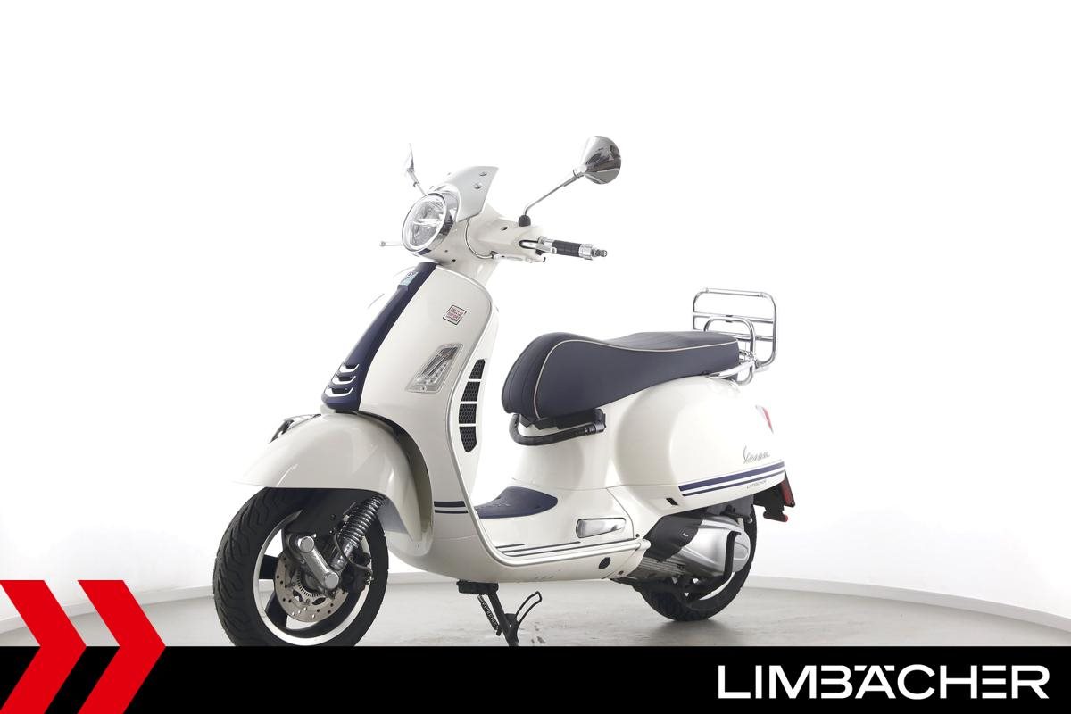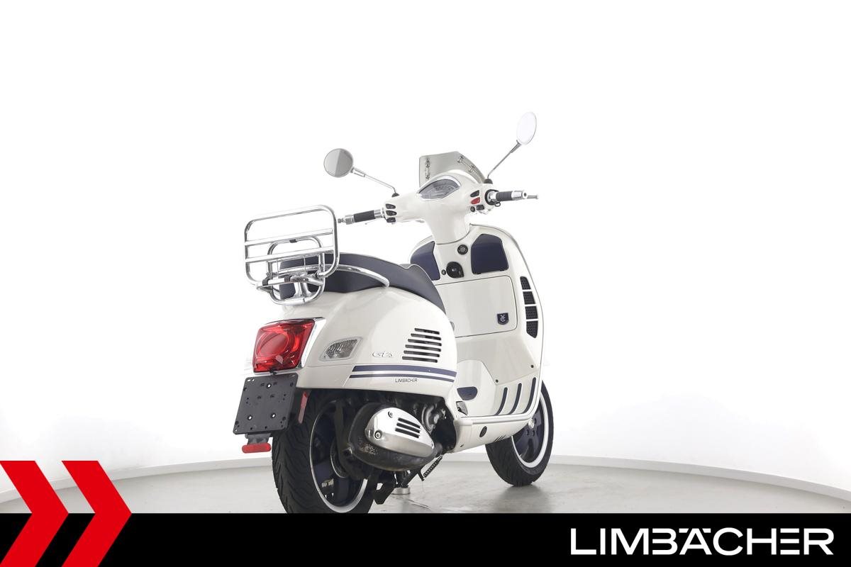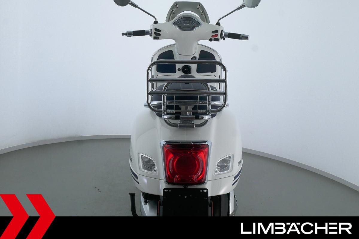 Eine Vespa GTS 300 aus zweiter Hand in gepflegtem Zustand u.a. als Yacht-Club Edition mit Chrom-Gepäckträger.