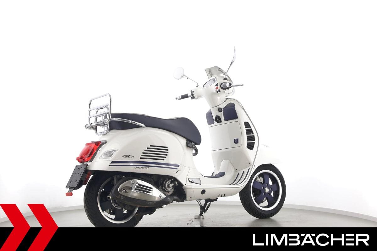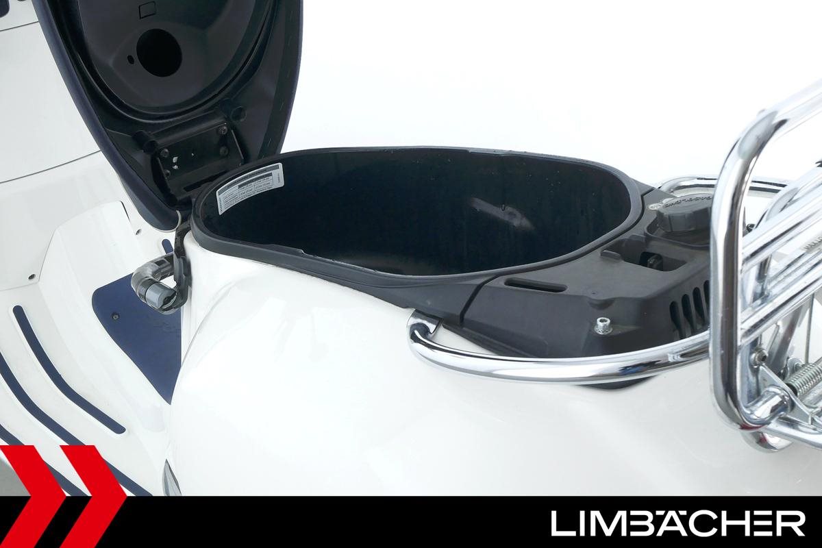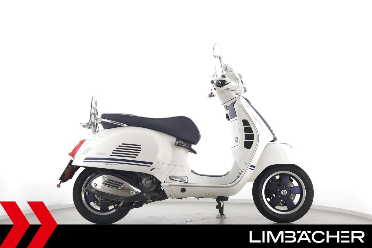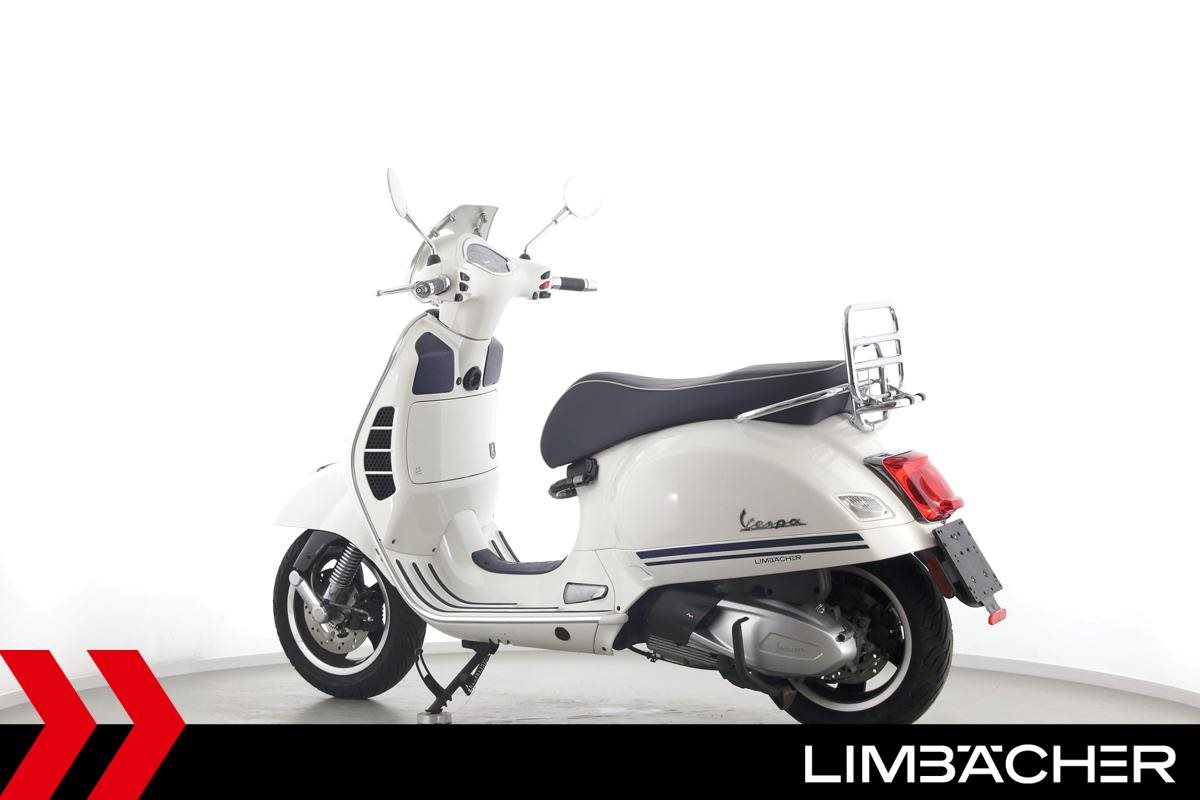 Eine Vespa GTS 300 aus zweiter Hand in gepflegtem Zustand u.a. als Yacht-Club Edition mit Chrom-Gepäckträger.