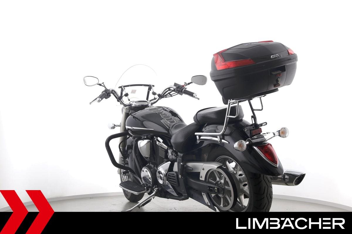 Eine Yamaha XVS 1300 A Midnight Star in gebrauchtem Zustand u.a. mit Topcase und Sissybar.