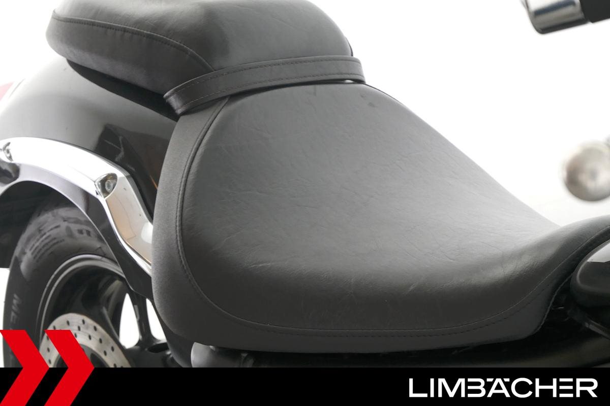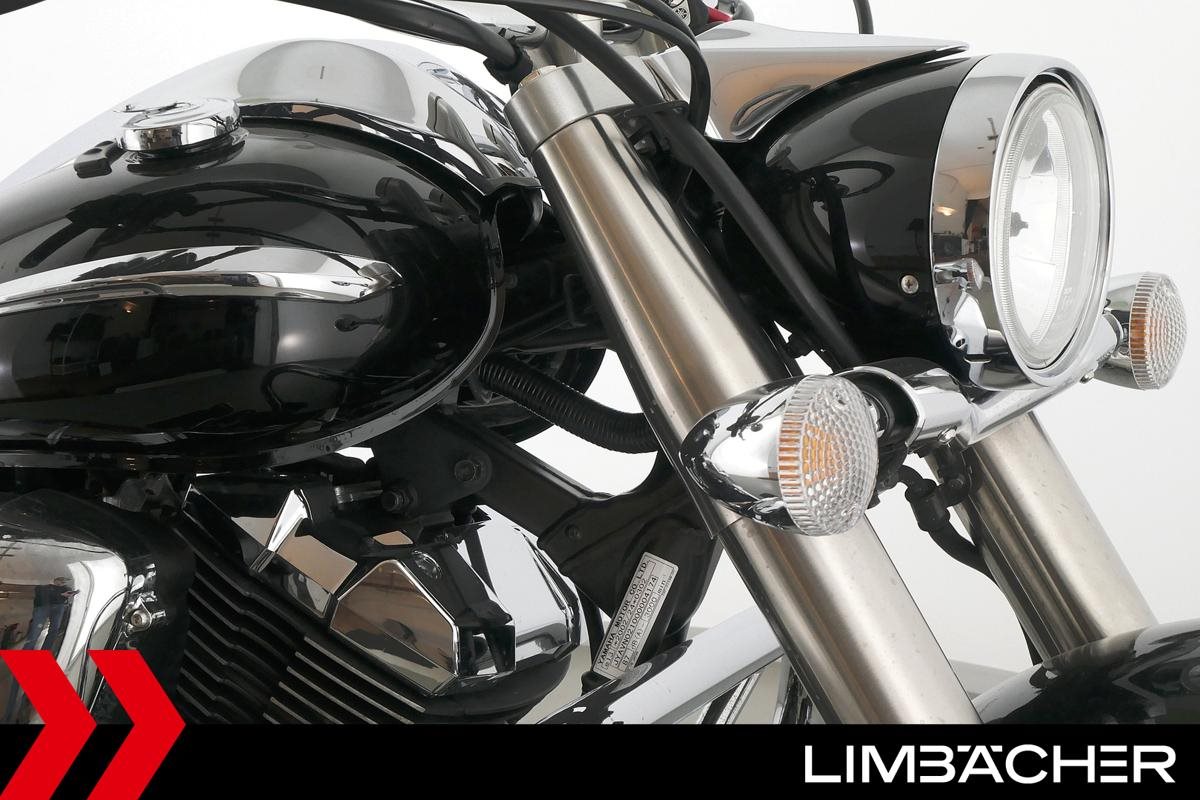 Eine Yamaha XVS 950 A Midnight Star in gepflegtem Zustand mit Sturzbügel und Tankpad.
