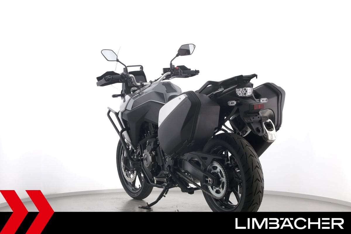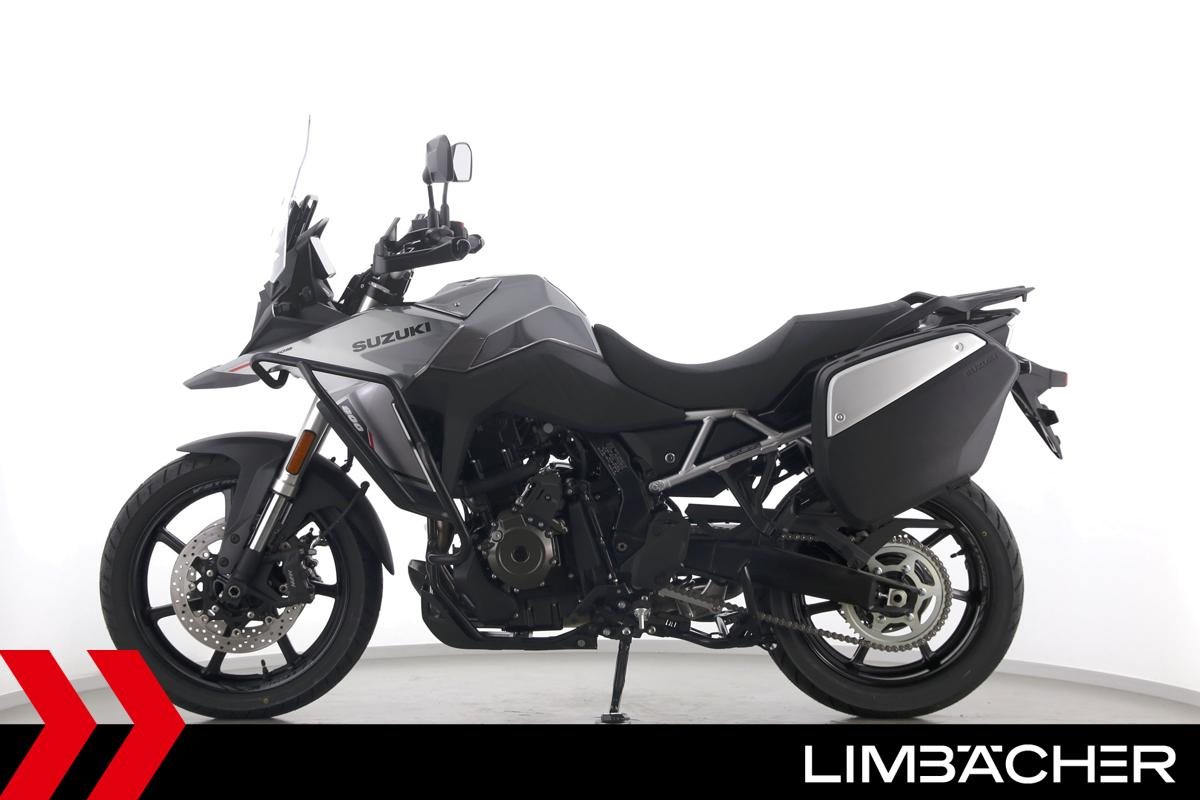 Eine Suzuki DL 800 V-Strom als Neufahrzeug u.a. mit Suzuki-Koffersystem gleichschließend sowie Sturzbügel in schwarz.