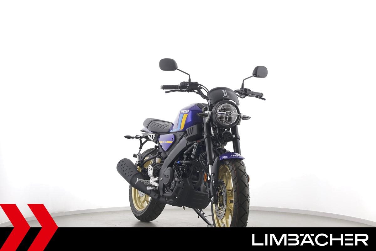 Eine Yamaha XSR 125 als Neufahrzeug u.a. mit gefrästen Brems- und Kupplungshebeln und kurzem Kennzeichenhalter.